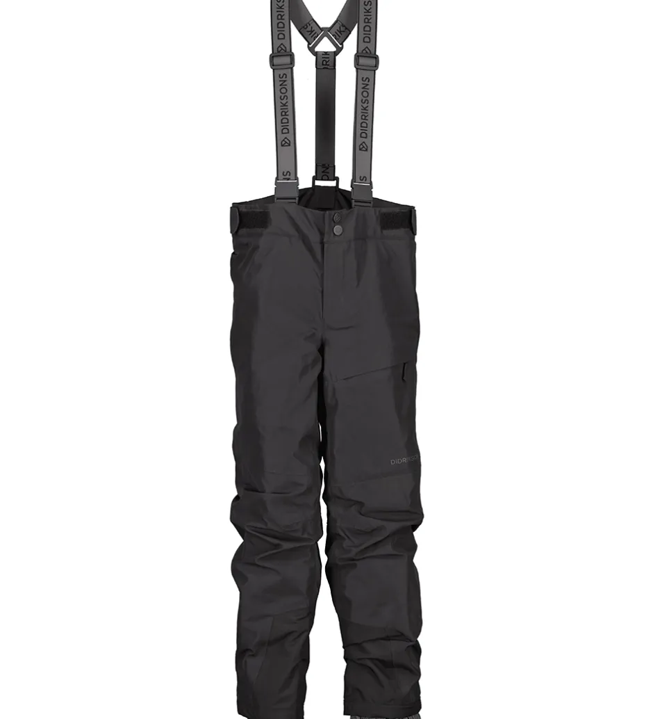 Didriksons skibukserne åbnes fortil med trykknapper og lynlås med dobbelt vindstolpe, hvoraf den udvendige lukkes til ved hjælp af velcro. Skibukserne har justerbare, aftagelige seler samt velcrojusteringer i livet. På venstre lår er der en skuljt lynlåslomme.