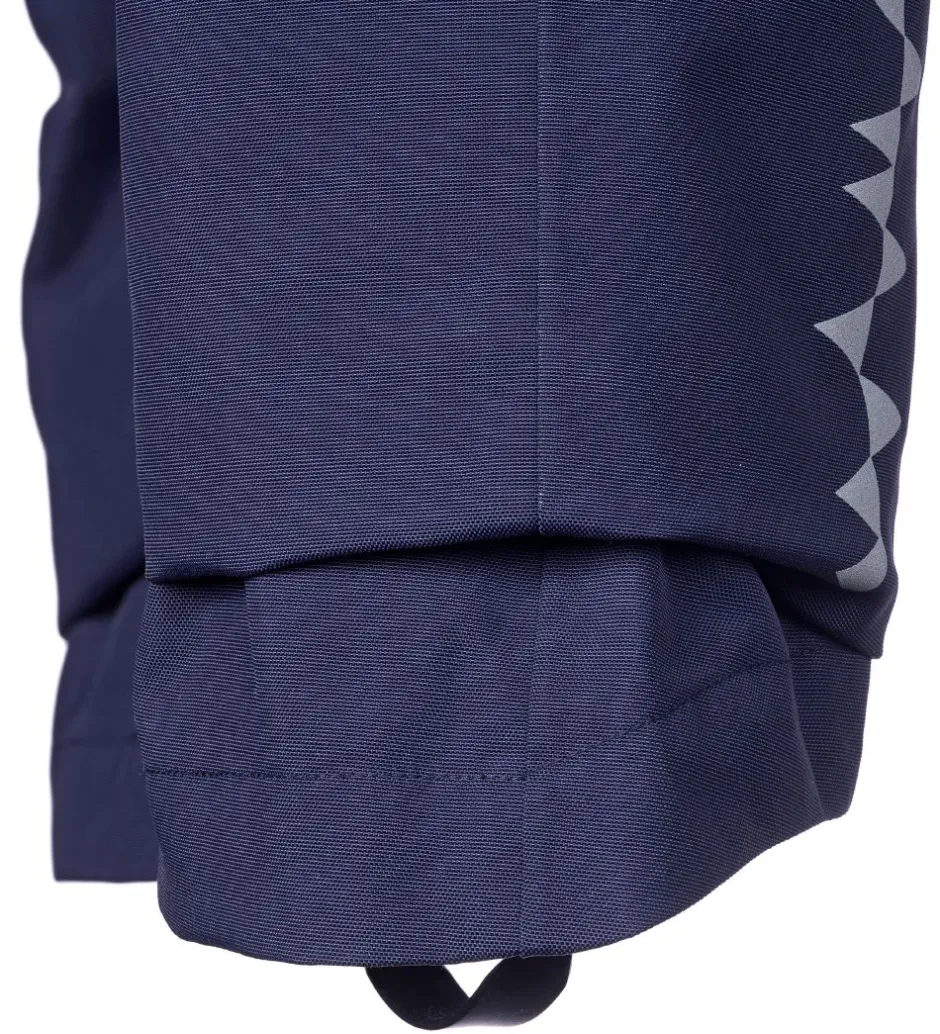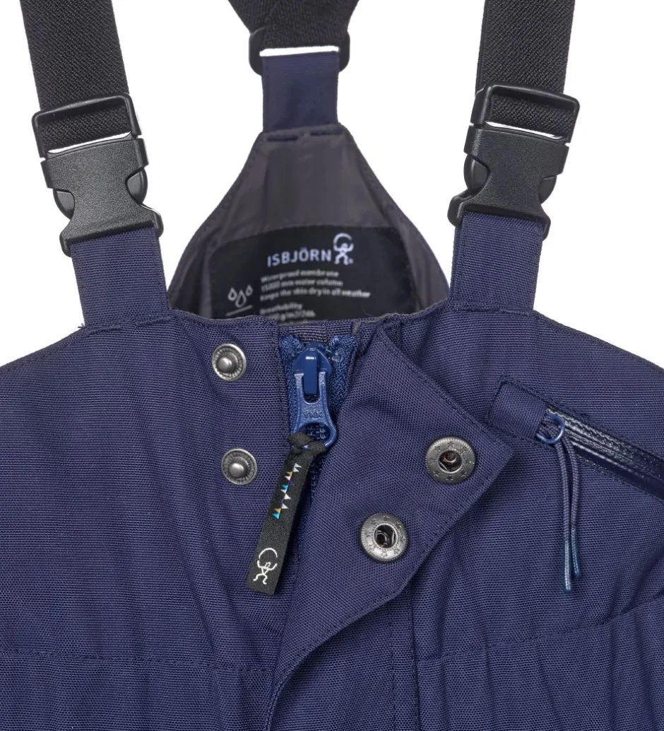 Isbjörn Of Sweden skibukserne åbnes fortil med to trykknapper og en lynlås. I benåbningerne har de snefang med en elastikkant, der har en indvendig gummibelægning. Der er også aftagelige, justerbare støvlestropper i gummi, som der medfølger én ekstra af.