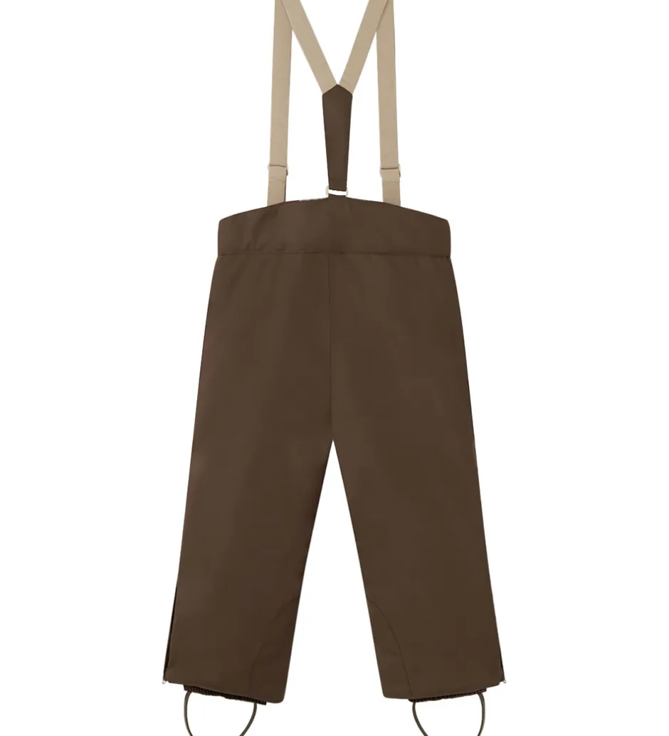 Smarte MarMar skibukser i mørkebrun med lyse seler og refleksdetaljer langs ydersiden af benene.