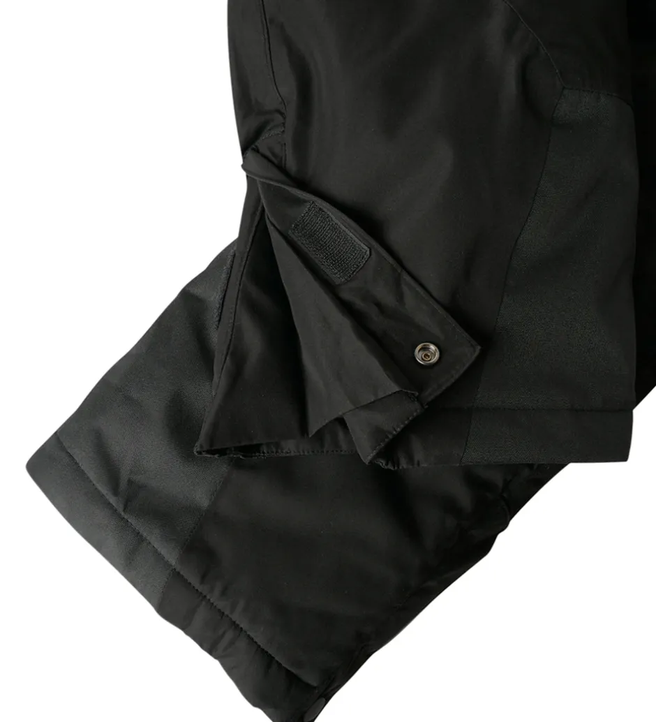 Buksebenene har snefang med en gummibelægning på indersiden. Selve benåbningen kan også justeres med velcro og trykknapper. Skibukserne er lunt vatterede og har et glatvævet for.