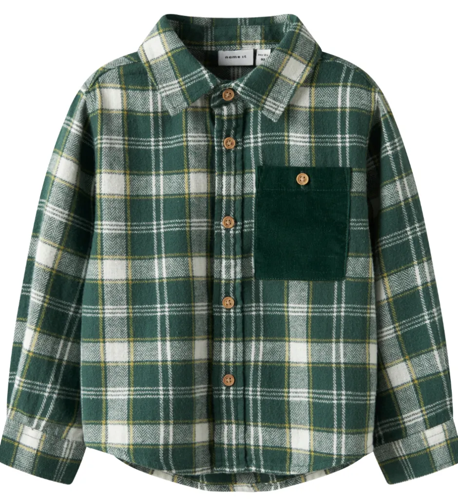 Stilfuld Name It skjorte i et flot ternet mønster i grøn, hvid og gul. Skjorten har lange ærmer og en klassisk krave samt en praktisk brystlomme. Den har gennemgående knapper fortil samt manchetknapper ved håndleddene. Skjorten er lavet i en meget blød kvalitet.