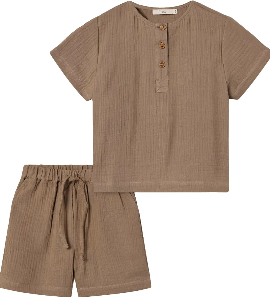 Skønt Fliink shortssæt bestående af en t-shirt og et par shorts i brun med en musselin-struktur.