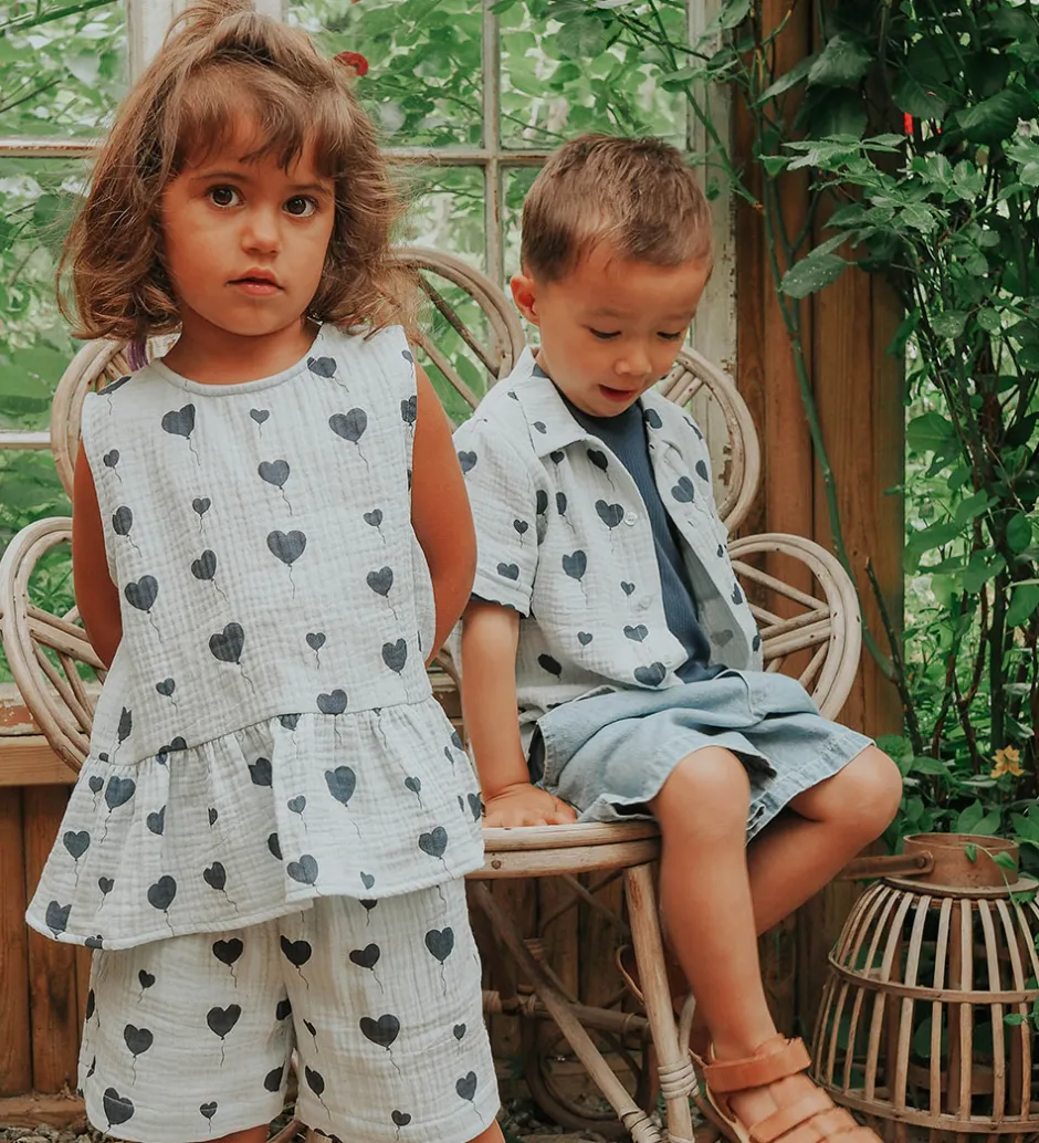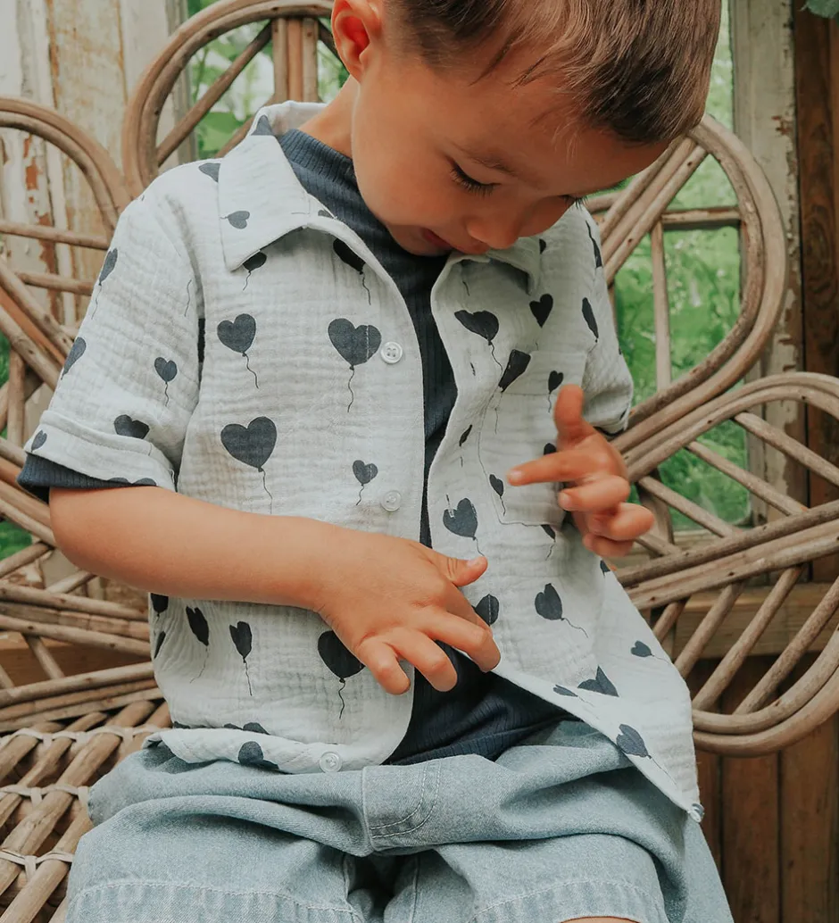 Flot Fliink skjorte i en lys blå nuance med korte ærmer. Skjorten har et charmerende allover print af mørkeblå, hjerteformede balloner, der tilføjer et unikt touch til designet.