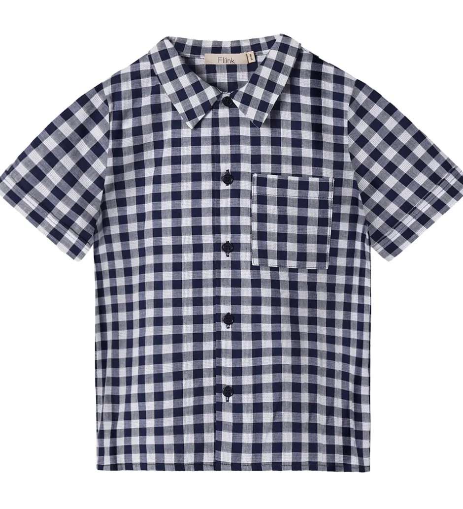 Flot Fliink skjorte med korte ærmer i en klassisk blå og hvid ternet mønster. Skjorten har en praktisk lomme på brystet og en knaplukning foran, der giver et stilrent look.