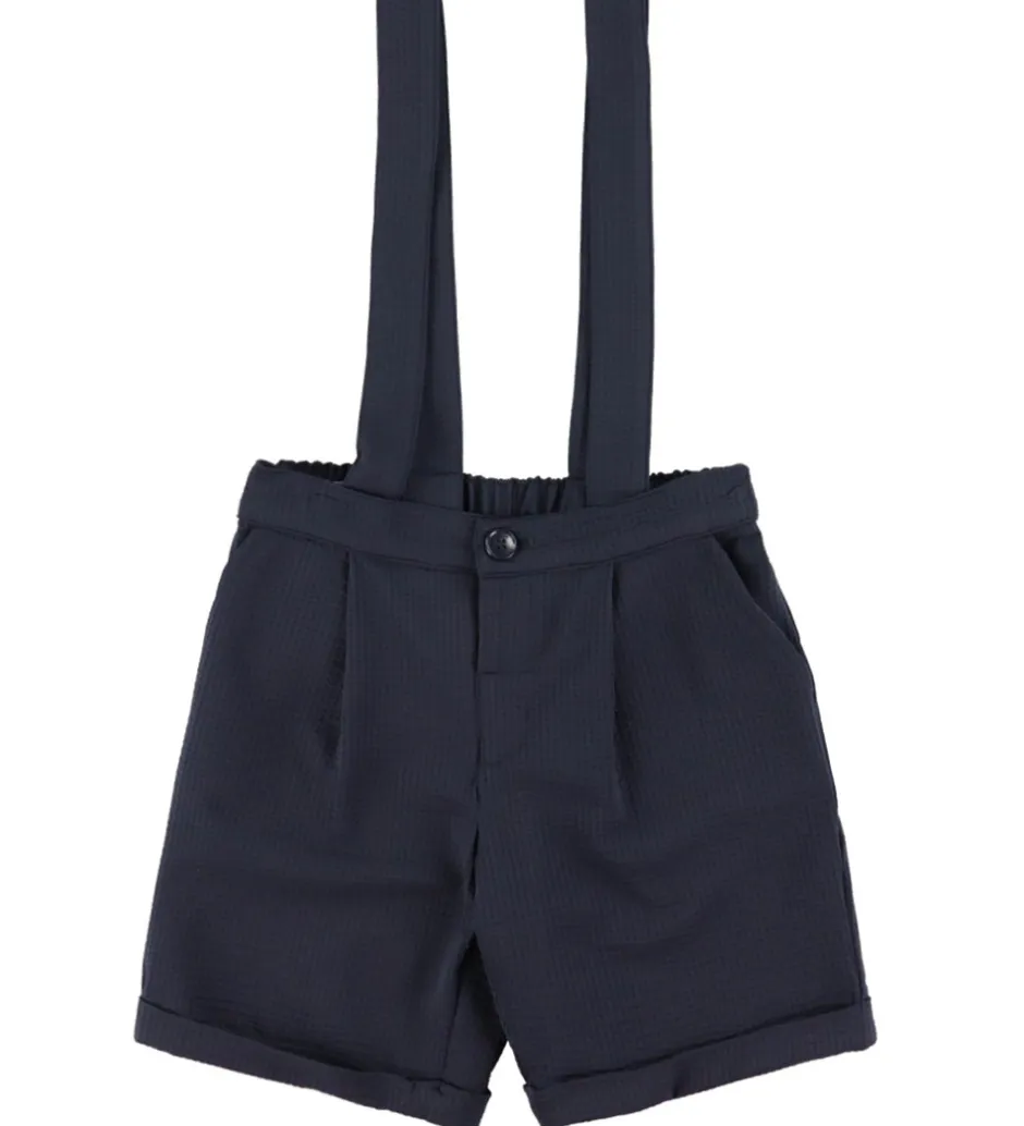 Shortsene er en lang model med en løs pasform. Buksebenene har flotte opsmøg, og i livet er der en kant med elastik i ryggen. Shortsene åbnes fortil med en knap. Shortsene har flotte seler, som kan justeres i to længder med en knap på indersiden, og i siderne er der praktiske lommer. Shortsene er lavet i en let, strækbar kvalitet. Sættet er erfekt til både formelle og afslappede anledninger.