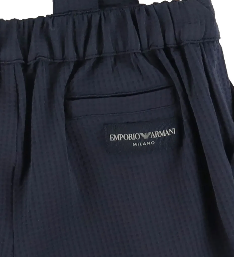 Elegant Emporio Armani sæt, der består af en skjorte og et par shorts. Skjorten er ensfarvet hvid, og shortsene er ensfarvet navy med en flot vaffelstruktur.