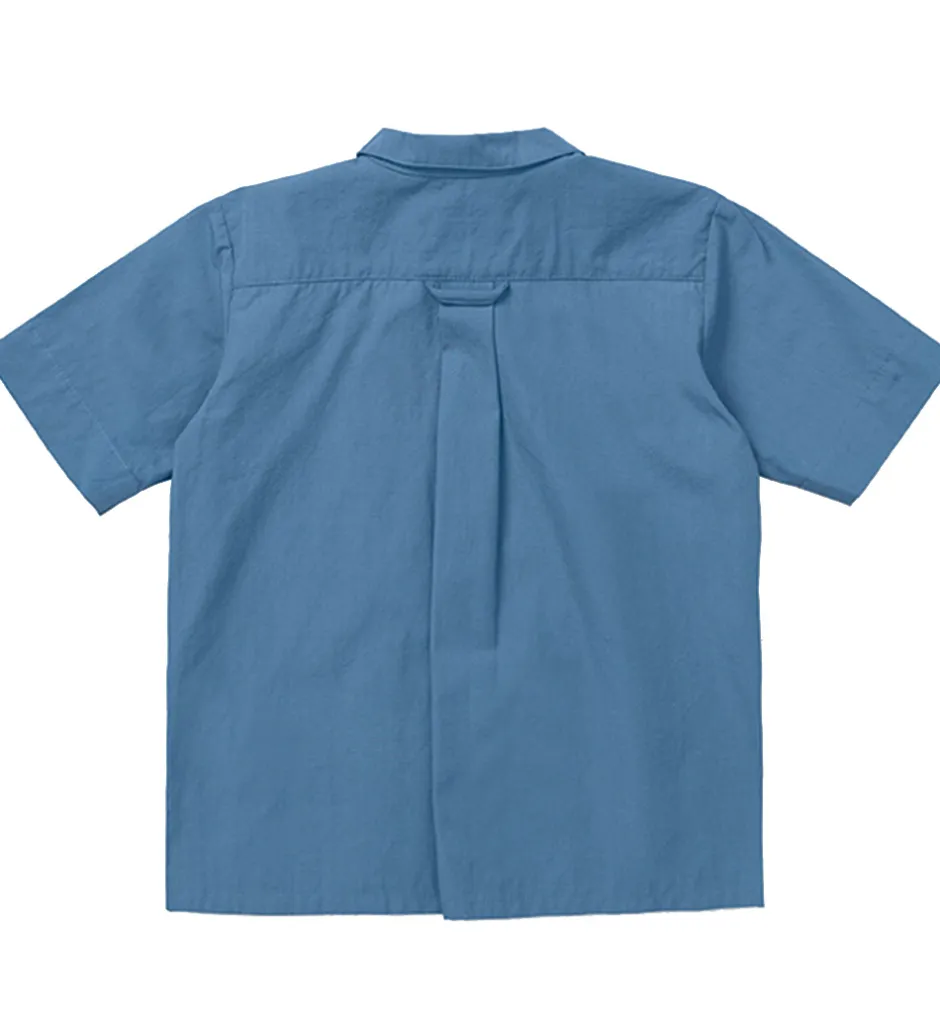 Skøn Lalaby skjorte med korte ærmer i en blød blå farve. Skjorten har en klassisk krave og en praktisk lommesyning på fronten, hvilket gør den til et stilfuldt valg til enhver anledning.