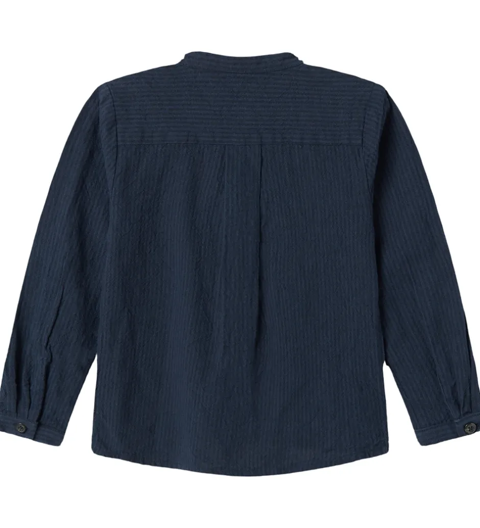 Flot MarMar skjorte i en dyb, marineblå farve med striber. Skjorten har lange ærmer og en rund halsudskæring. Den er designet med en enkel række knapper foran, hvilket giver et stilrent udtryk.