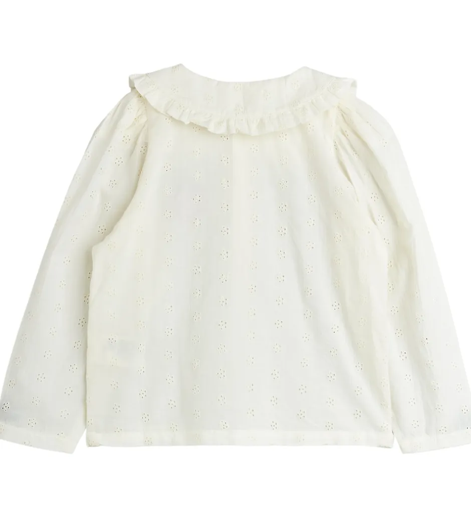 Charmerende Mini Rodini skjorte i ensfarvet hvid med broderede små blomster. Skjorten har lange ærmer og en elegant flæsekrave. På brystet findes en dekorativ brodering af et jordbær, som giver et unikt udtryk. Mini Rodini skjorten har en klassisk knappelukning foran, og den er lavet i en let, fastvævet kvalitet.