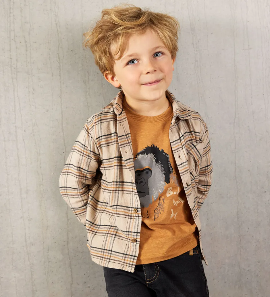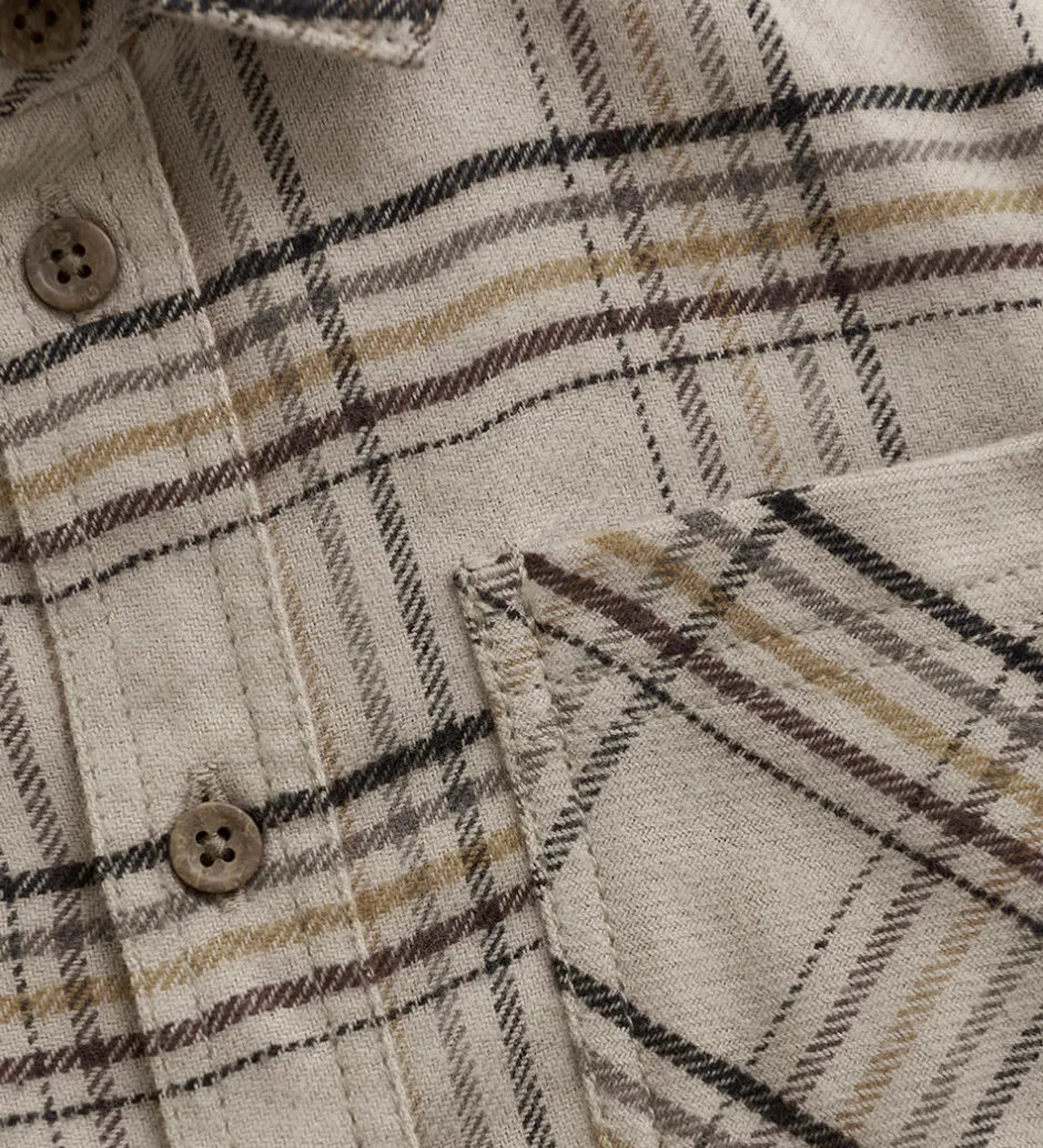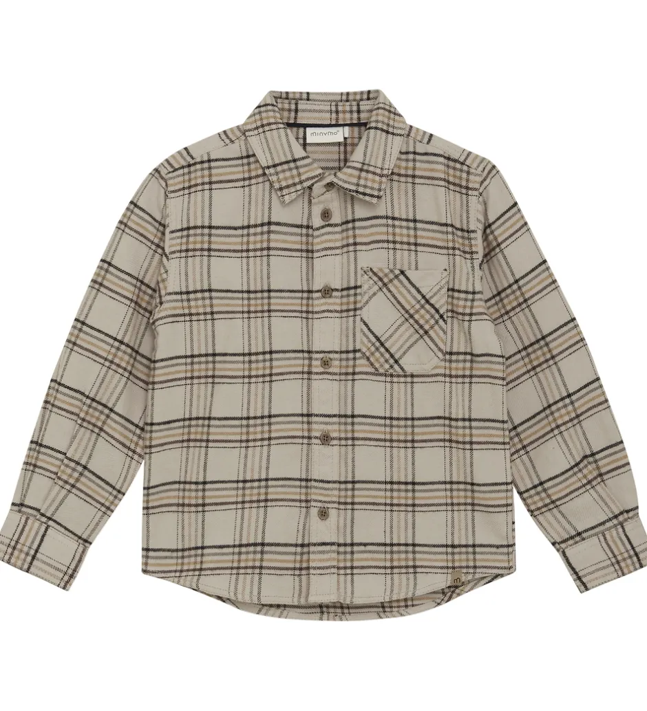Stilfuld Minymo skjorte med lange ærmer med et flot ternet mønster og i blødt flonel. Skjorten har en klassisk krave og en praktisk brystlomme. Farverne er en kombination af beige, sort og brun, der giver et tidløst udtryk.
