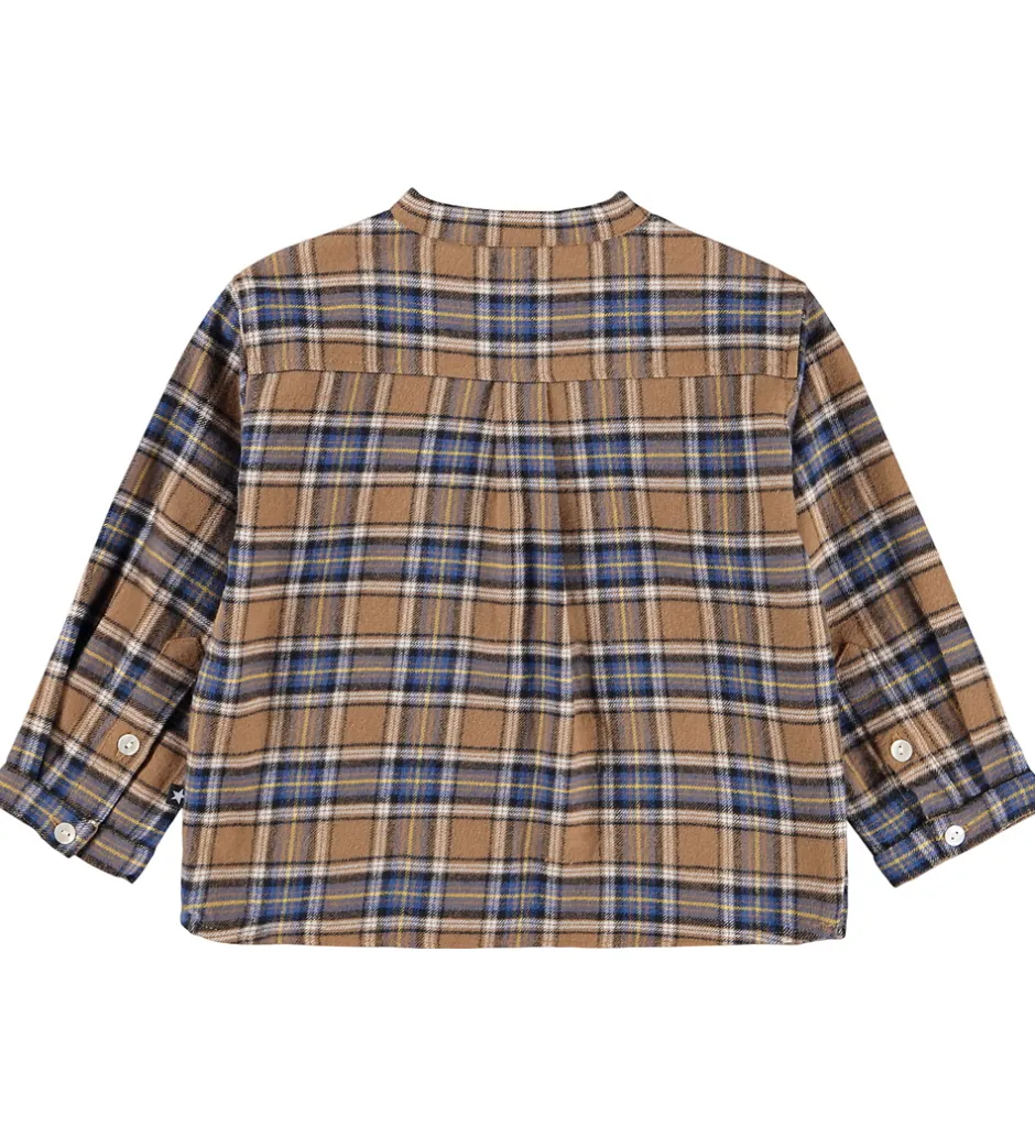 Stilfuld Molo skjorte med et klassisk ternet mønster i nuancer af brun og blå. Skjorten har en kinakrave med tre lyse knapper foran. Den har lange ærmer med knapper ved håndleddene. Skjorten er fremstillet i en blød, let børstet bomuldskalitet.