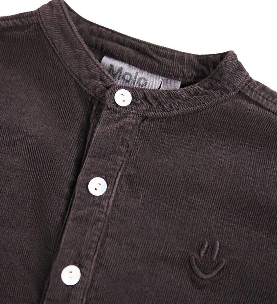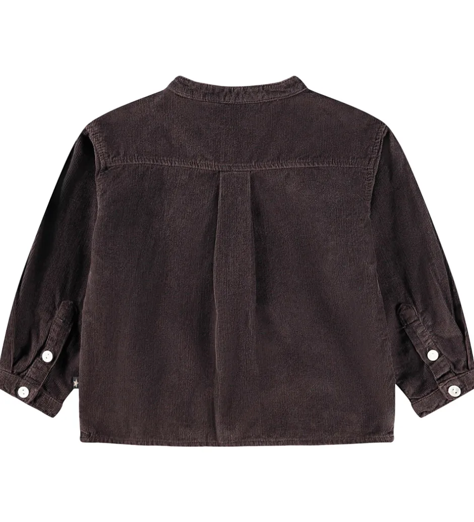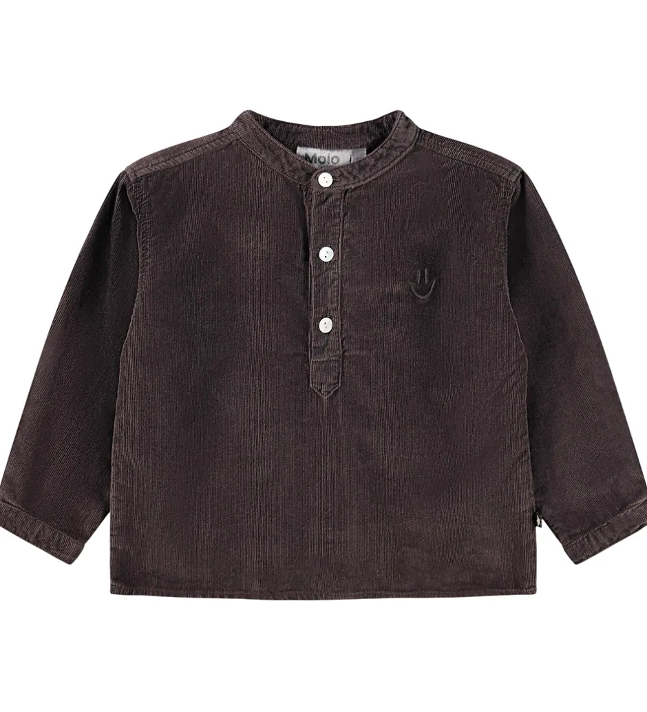 Stilfuld Molo skjorte i mørkebrun babyfløjl med et diskret broderi på brystet. Molo Skjorten har en rund halsudskæring med stolpelukning fortil samt lange ærmer med slids- og knaplukning.