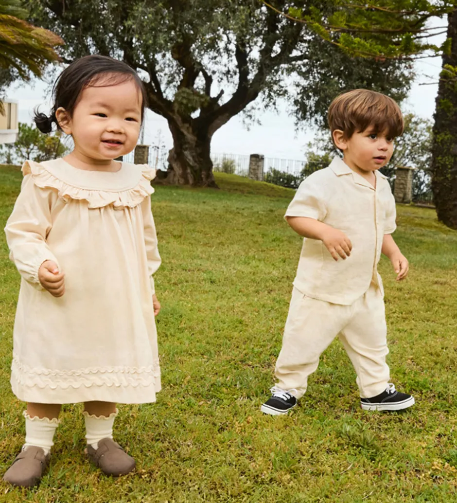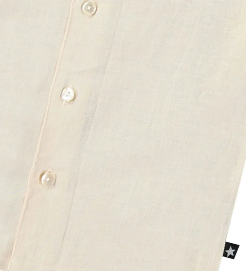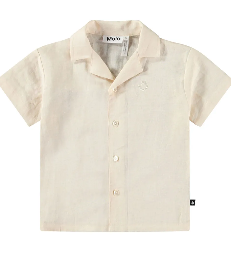 Skøn Molo skjorte med korte ærmer i en lys beige farve og med en diskret, broderet smiley på venstre bryst.