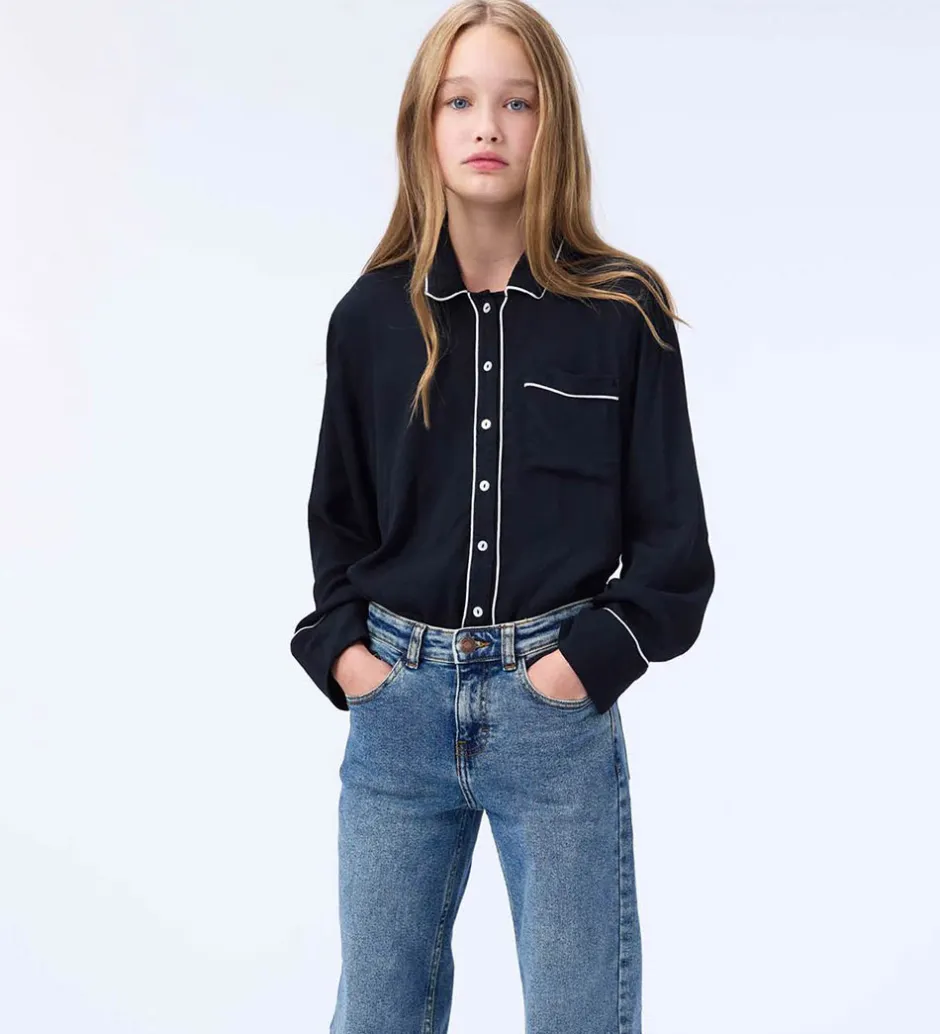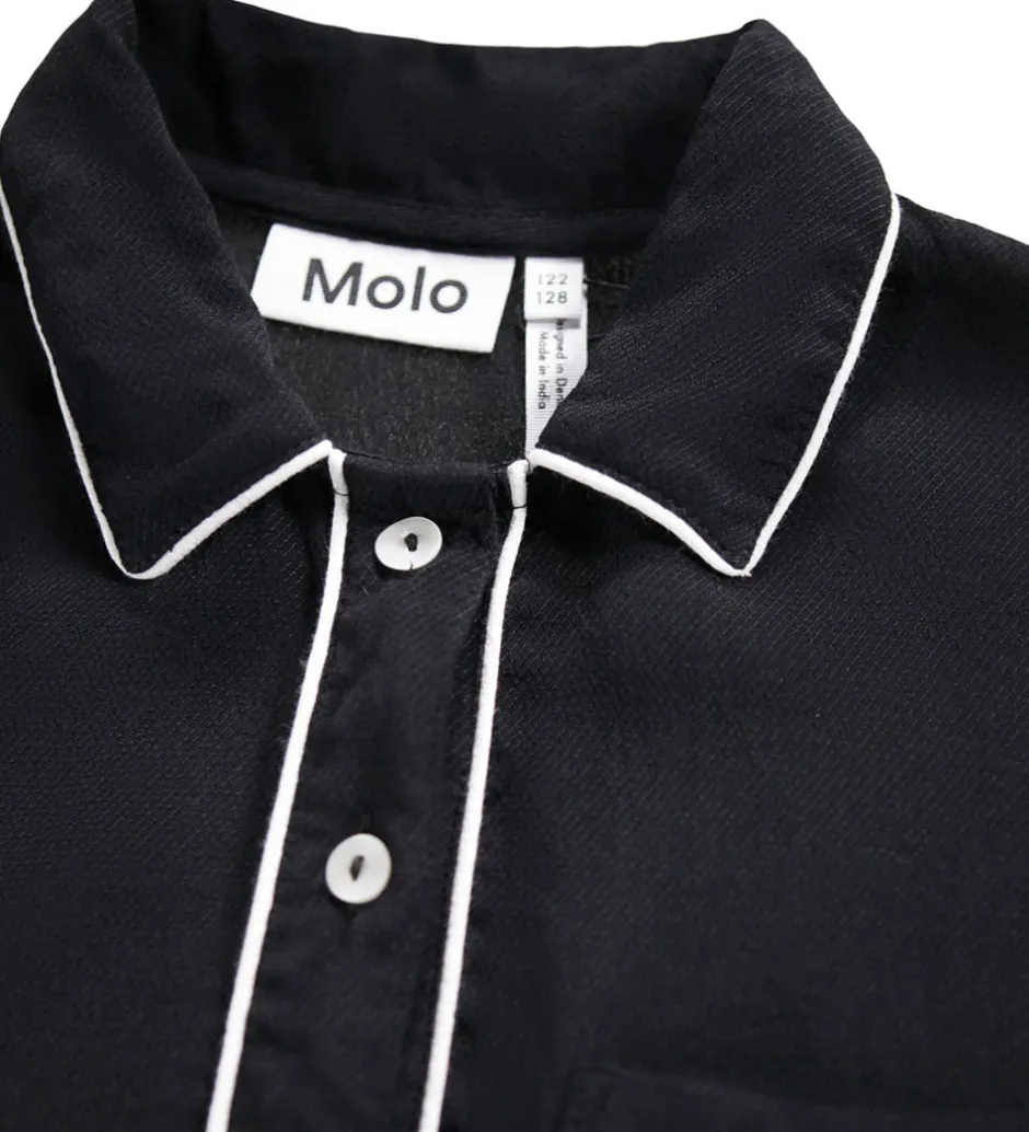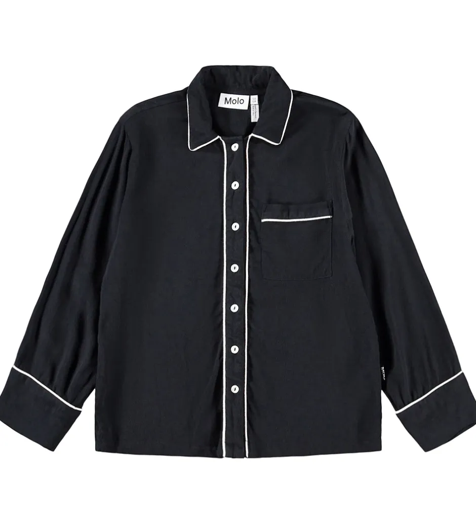 Elegant Molo skjorte med lange ærmer i sort. Skjorten har hvide kantdetaljer langs kraven, ærmerne og knaplukningen. Molo skjortens design er klassisk med en enkelt brystlomme, der også har hvid kant.