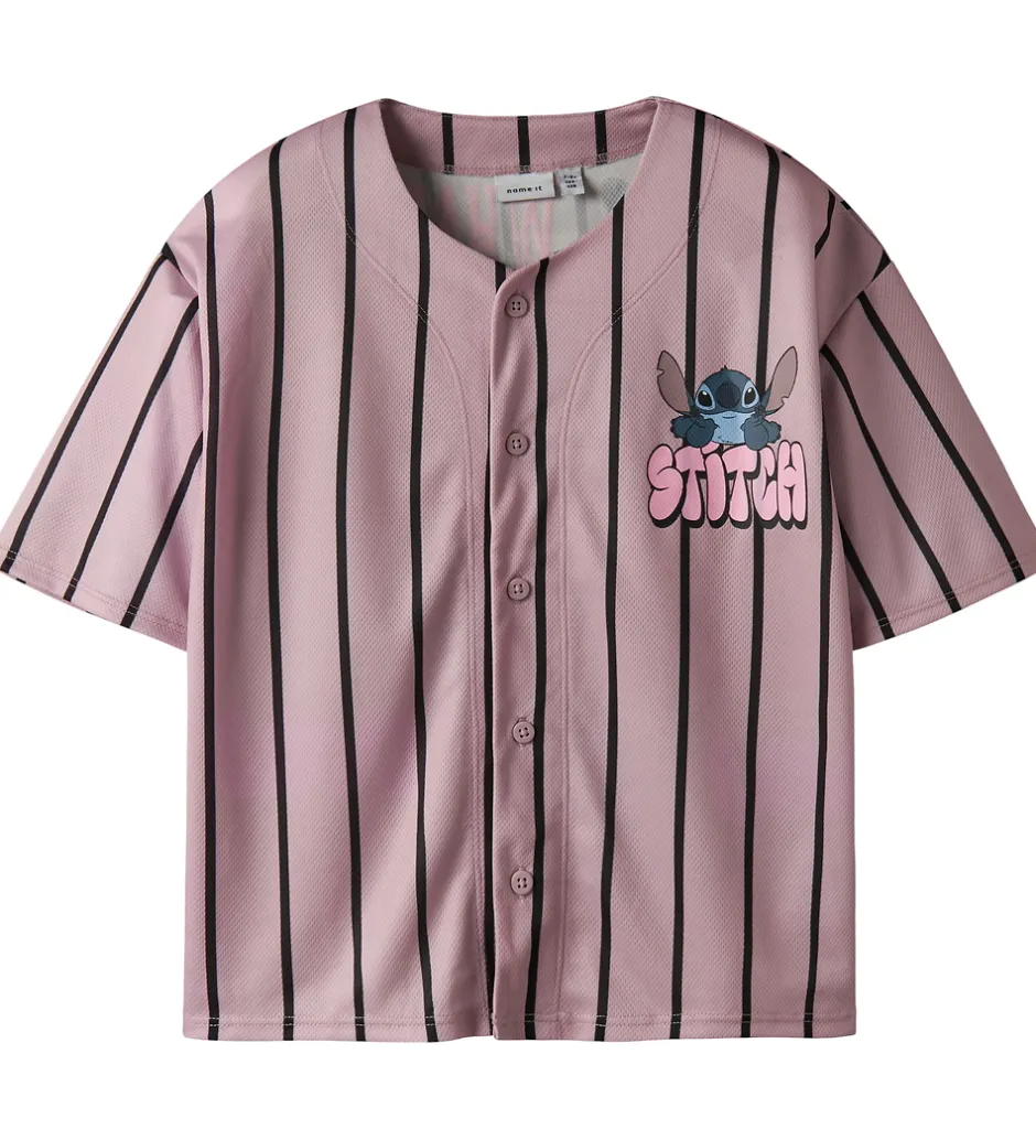 Stilfuld Name It skjorte med sporty design. Skjorten er rosa med sorte striber og et Stitch-print på venstre bryst og på ryggen. Den har korte ærmer og gennemgående knapper fortil.