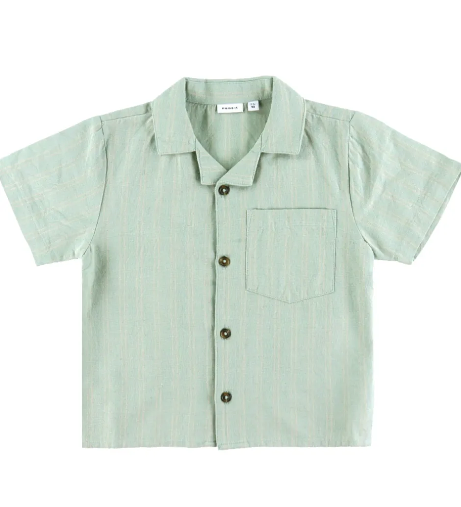 Elegant Name It skjorte i lysegrøn med diskrete striber i beige. Skjorten har korte ærmer og en klassisk krave. På forsiden er der fem mørke knapper samt en praktisk brystlomme. Den lette struktur gør denne Name It skjorte til et behageligt valg til forskellige anledninger.