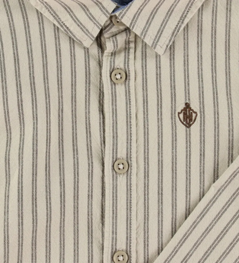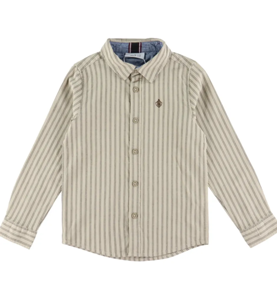 Stilfuld Name It skjorte i beige med lodrette striber i en mørk nuance. Skjorten har en klassisk krave og er dekoreret med en lille emblem på brystet. Name It skjorten har lange ærmer og gennemgående knaplukning foran.