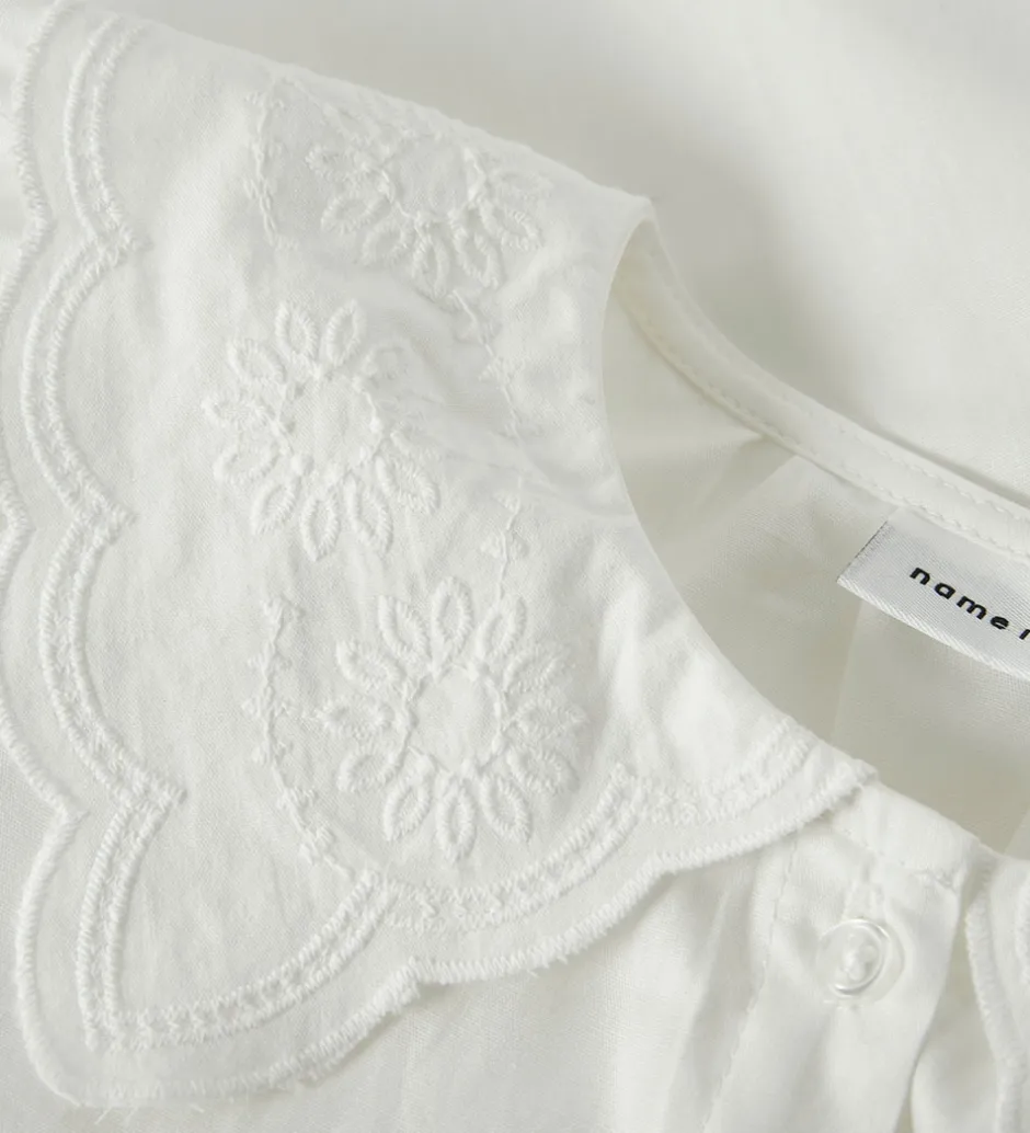 Charmerende Name It skjorte i hvidt bomuldspoplin. Skjorten har en elegant krave med dekorative broderidetaljer. Den lukkes fortil med gennemgående knapper, og den har lange, vide ærmer med elastik ved håndleddene.