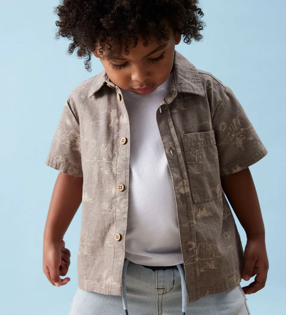 Lækker Name It skjorte med korte ærmer i en gråbrun nuance med et flot print, der viser bjerge og kaktuser. Skjorten har knaplukning og en brystlomme, hvilket tilføjer et praktisk touch til designet.