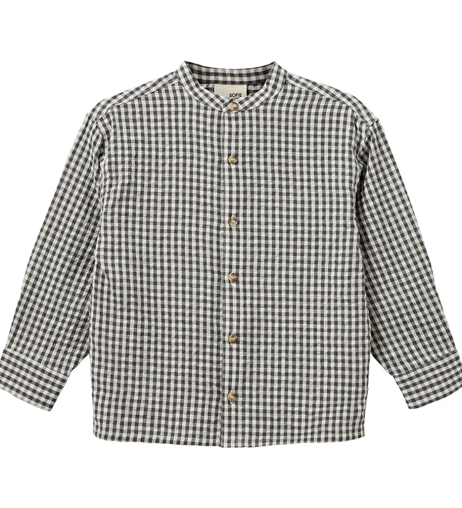 Sofie Schnoor skjorten åbnes fortil med gennemgående knapper, og i halsåbningen er der en flot kinakrave. I ærmeenderne er der slidser samt manchetknapper. Skjorten er i en let, fastvævet bomuldskvalitet.