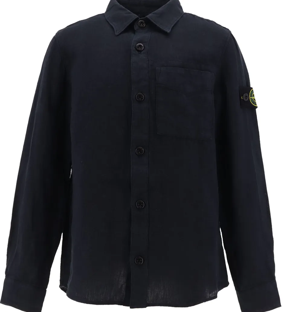 Flot Stone Island skjorte i ensfarvet navy hør i en fasttvævet kvalitet, og øverst på venstre ærme sidder det ikoniske logomærke fast med knapper.