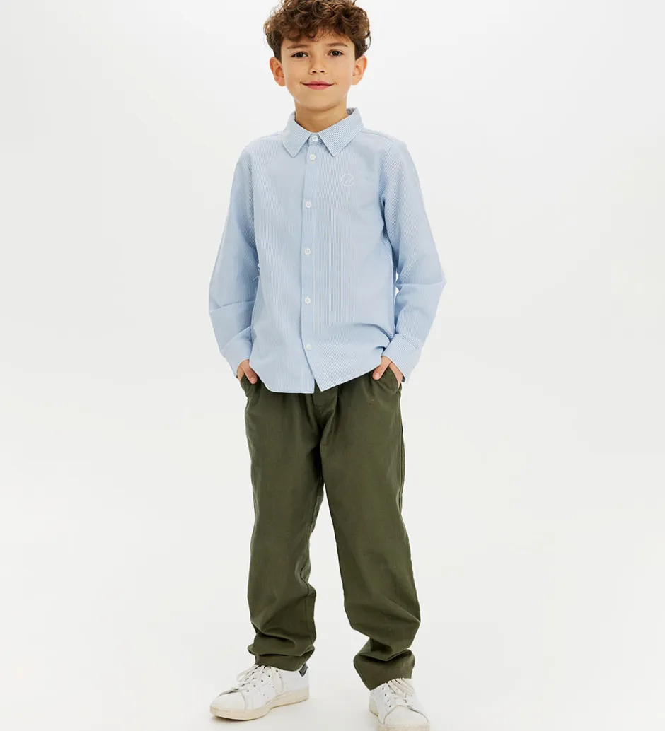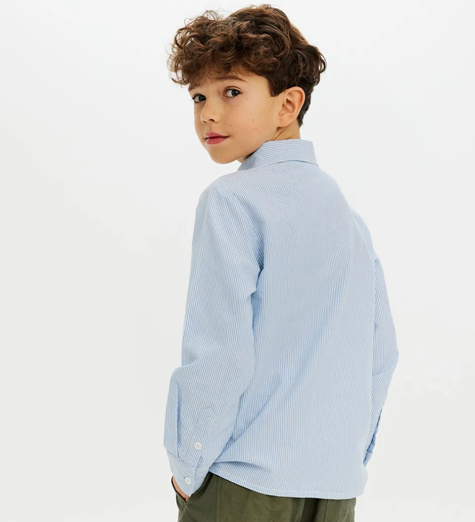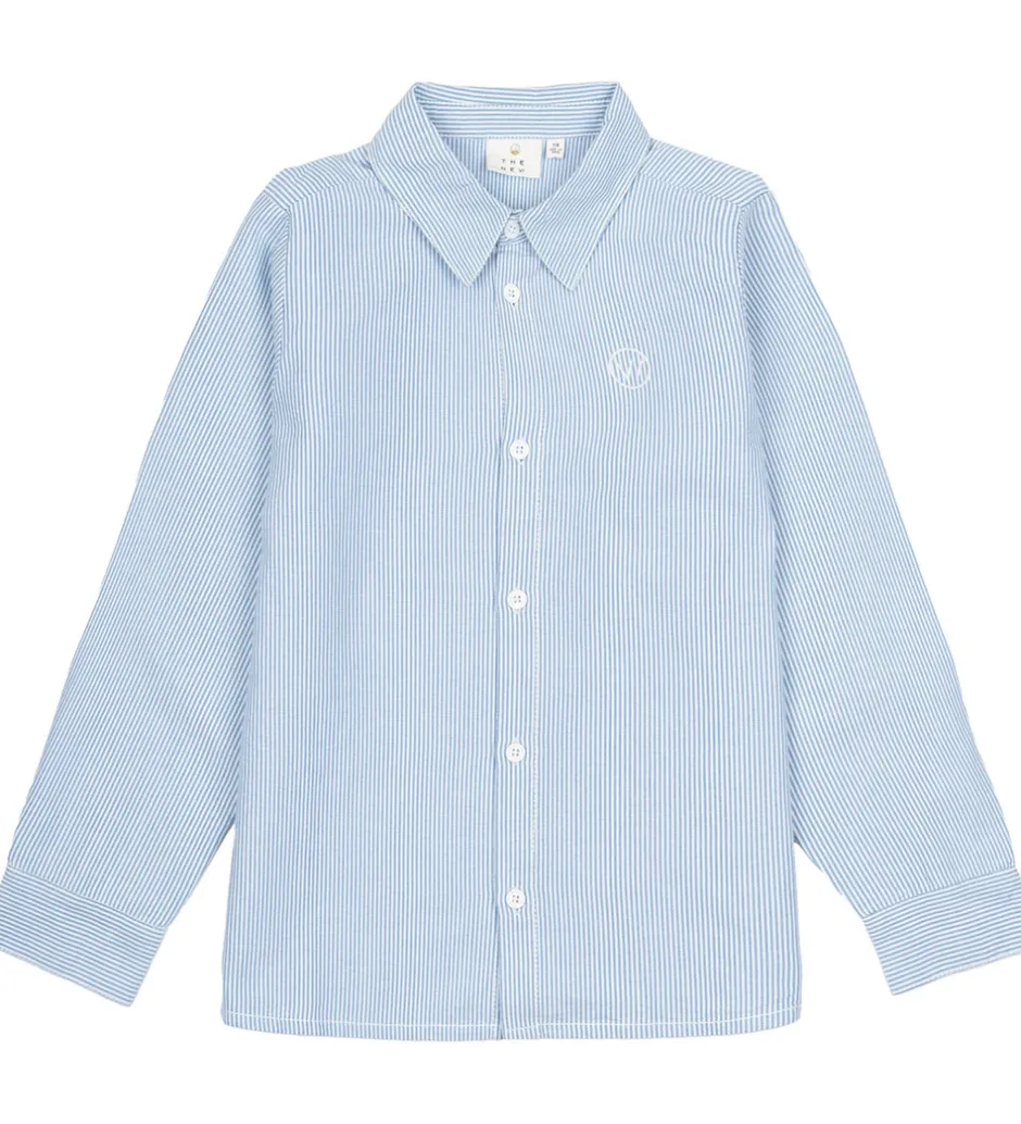 Stilet The New skjorte i et smalstribet og fastvævet design i blå og hvid og med et mindre, hvidt broderi på brystet i form af en cirkel med “W” indeni. The New skjorten har en klassisk, ombukket krave og lange ærmer med revers, slids og knaplukning med to knapper.