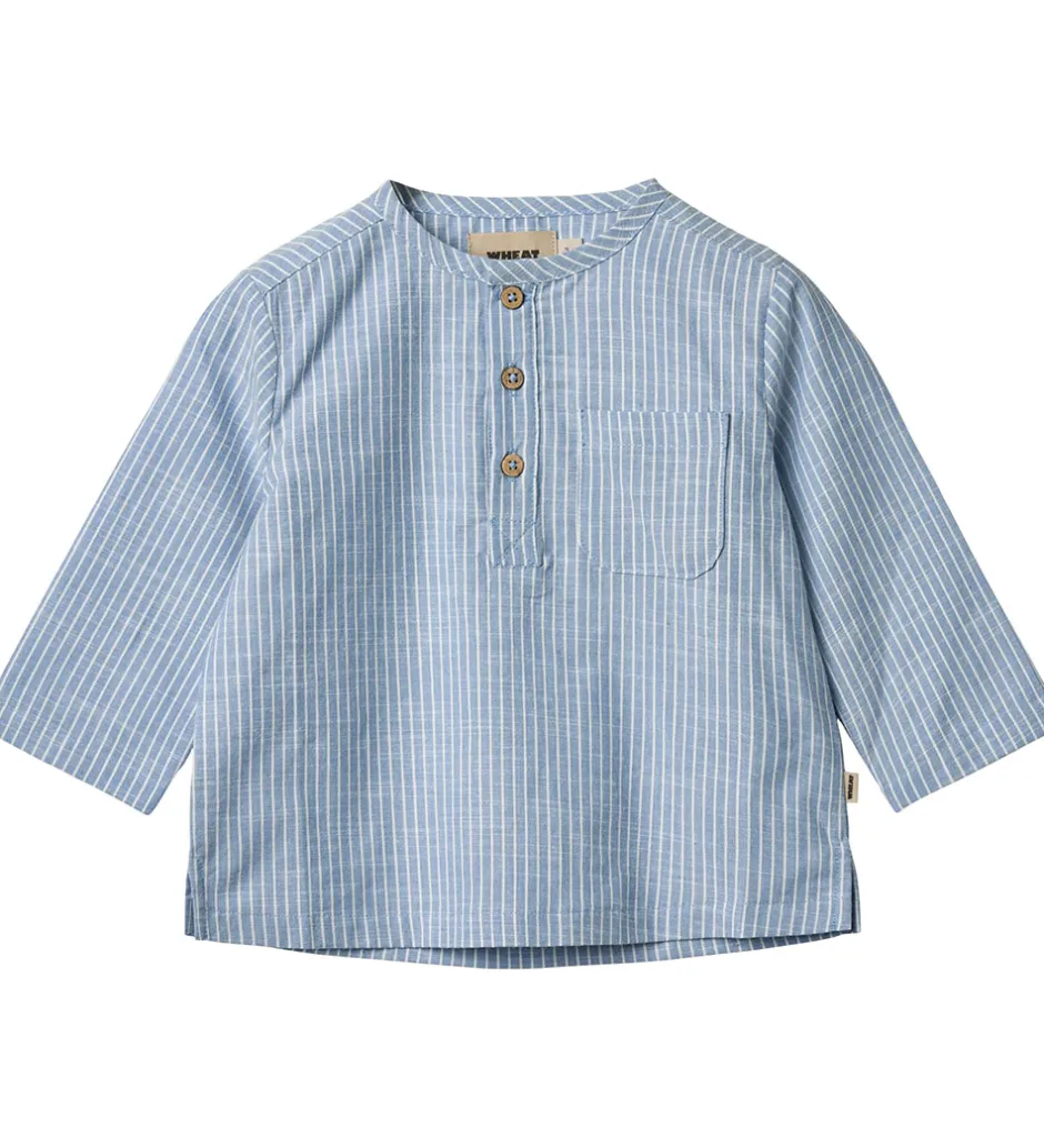 Fin Wheat skjorte i lyseblå med fine, hvide striber. Skjorten har knapdetaljer og en praktisk lomme på brystet, hvilket giver et let og stilrent look fra Wheat.
