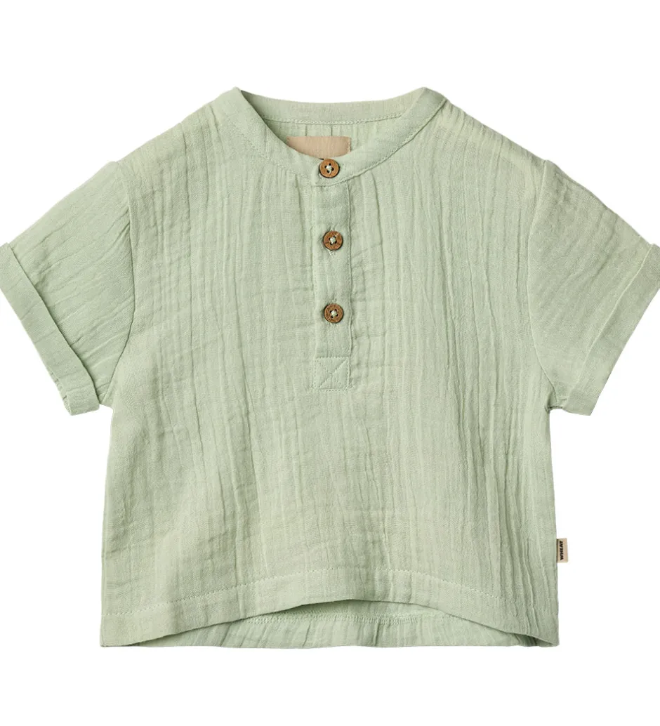Flot Wheat skjorte i en lysegrøn nuance med musselin struktur. Wheat skjorten har korte ærmer og tre praktiske knapper på fronten. Designet kombinerer komfort og stil, perfekt til en tidløs garderobe.
