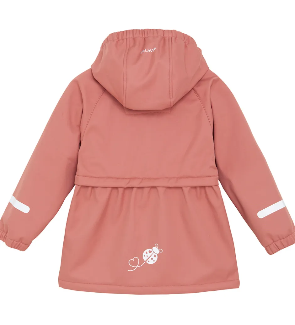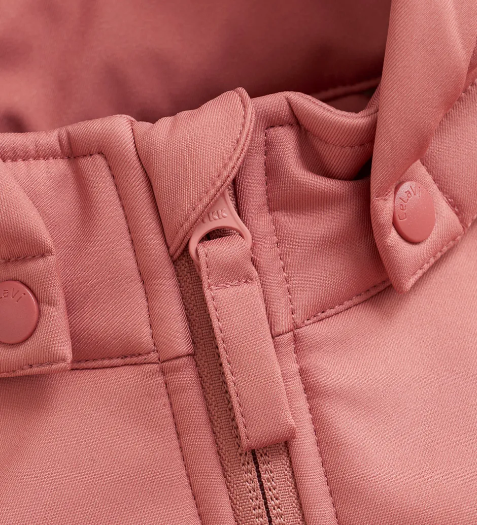 CeLaVi softshelljakken har en aftagelig hætte, som sidder fast med trykknapper, og den har smalle elastikkanter.