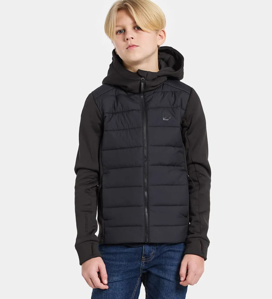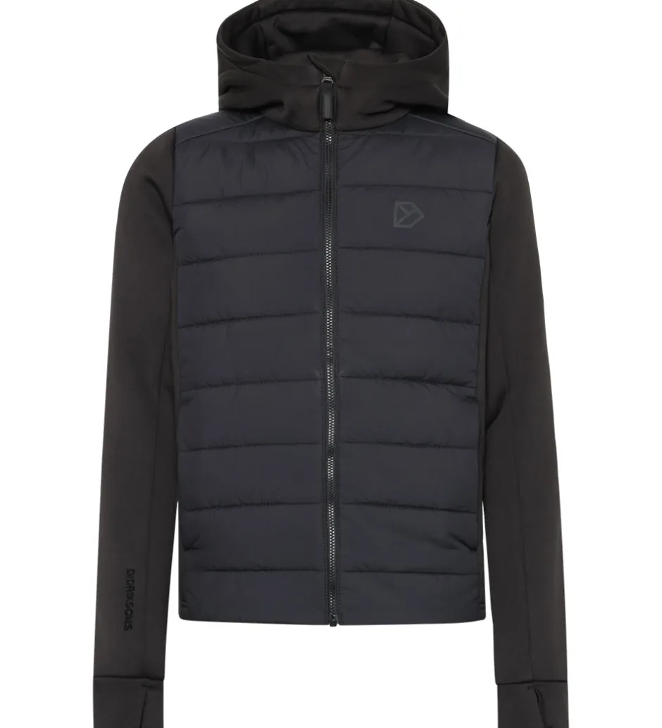 Fin Didriksons softshelljakke i sort. Kroppen er i et glatvævet materiale med vandrettte syninger, mens resten er i softshell.