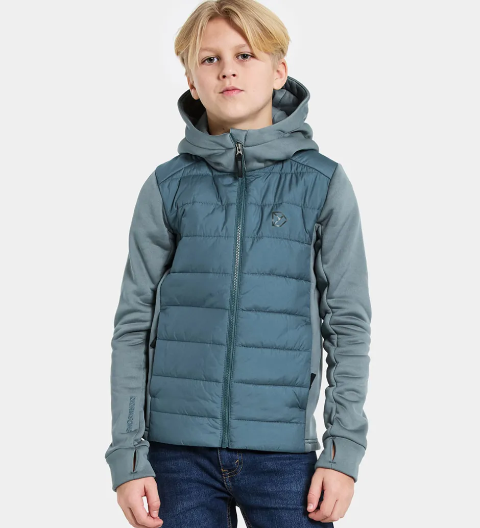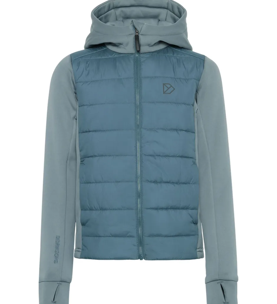 Fin Didriksons softshelljakke i blå nuancer. Kroppen er i et glatvævet materiale med vandrettte syninger, mens resten er i softshell.
