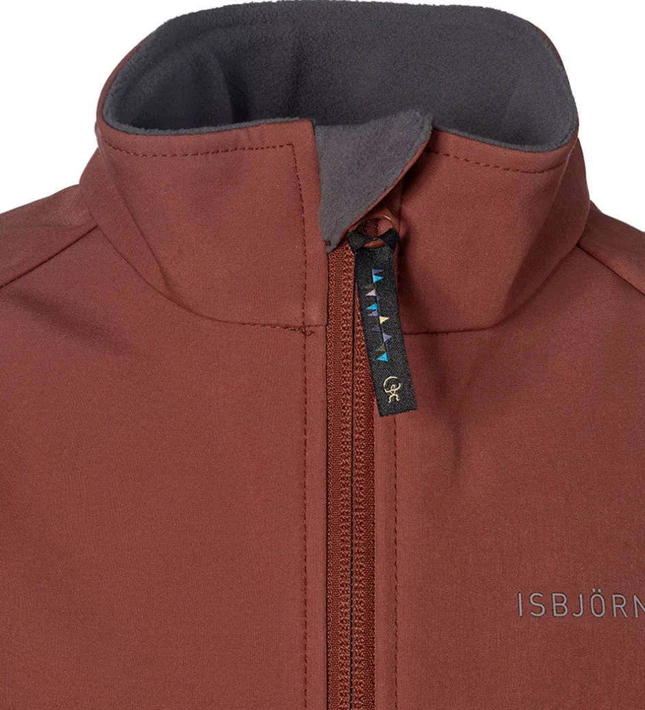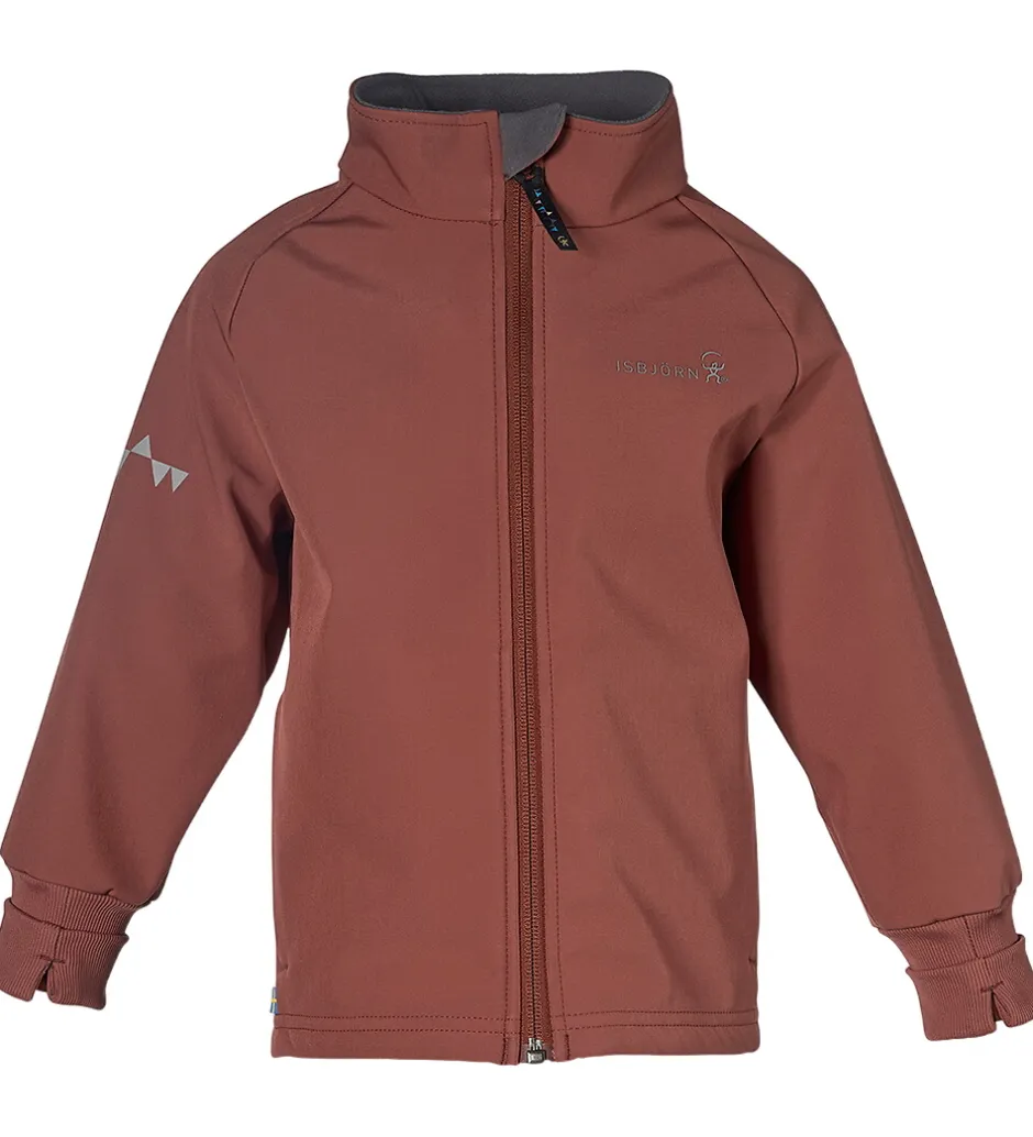 Skøn Isbjörn Of Sweden softshelljakke i rustrød med et reflekslogoprint på venstre bryst og i nakken.