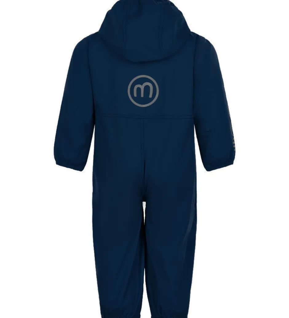 Flot Minymo softshelldragt i ensfarvet navyblå. Yderst på højre ærme og på ryggen er der praktiske refleksprint.