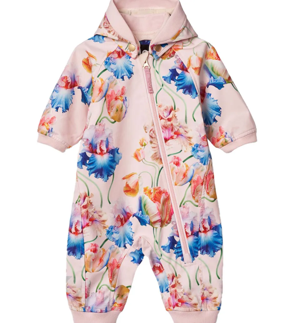 Skøn Molo softshelldragt i rosa med et alloverprint af store farverige blomster. Bagpå højre bukseben er der en stjerne i en refleks.