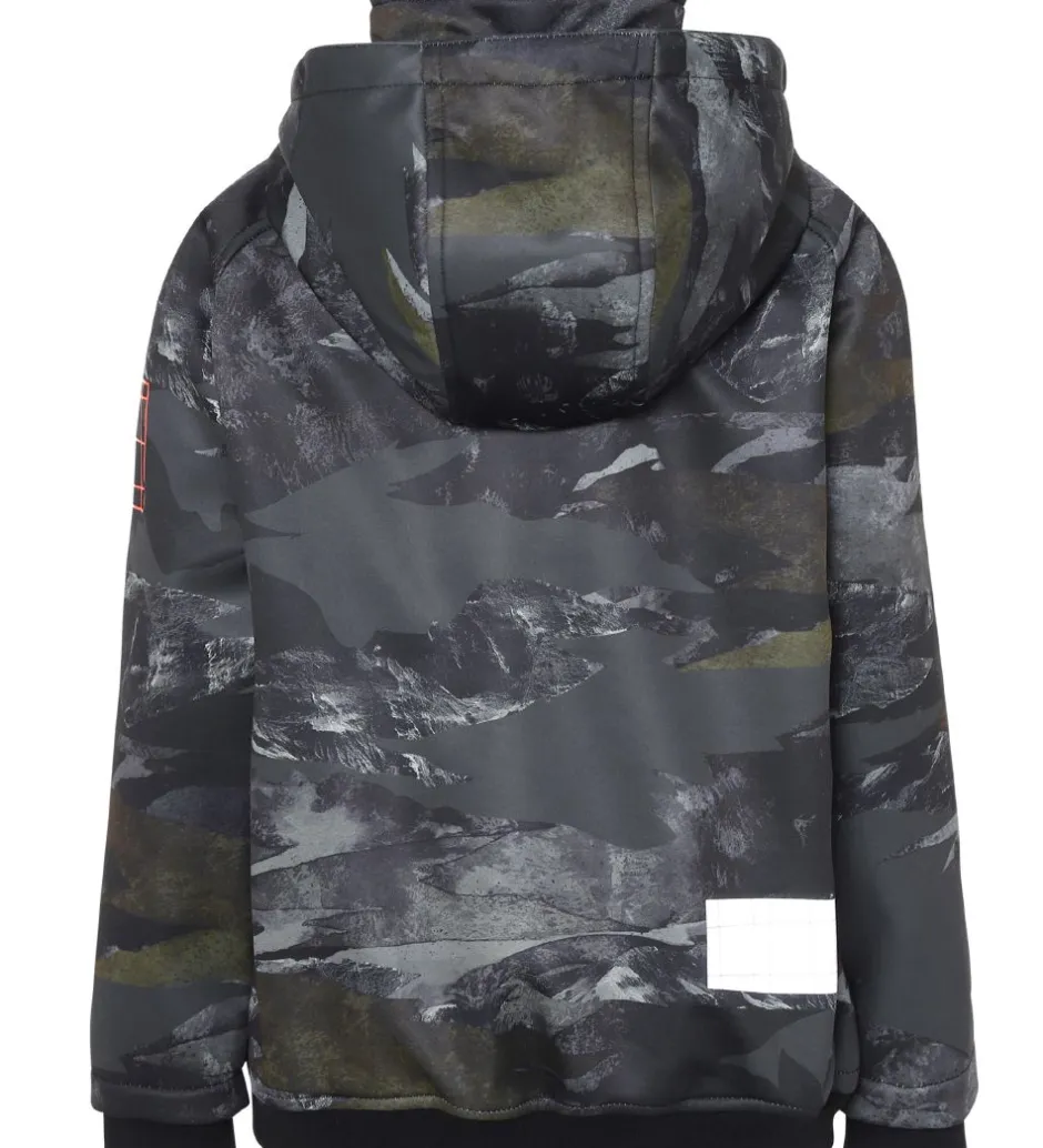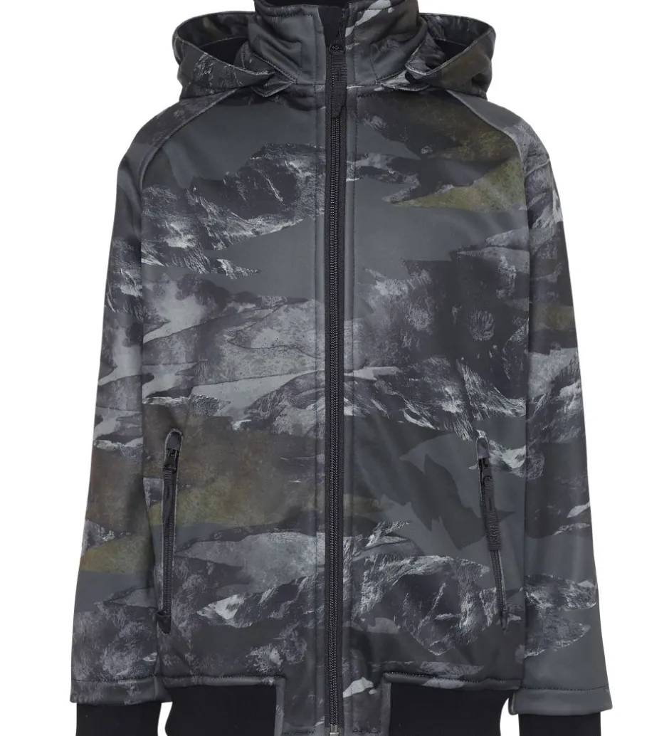 Lækker Molo softshelljakke med alloverprint af bjerglandskab i mørke, grå- og grønlige nuancer. Jakken har stor refleks i højre bund på bagsiden i form af et Molo logo.