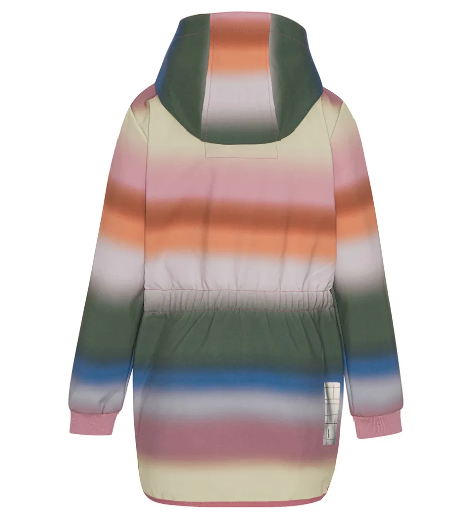 Skøn Molo softshelljakke med brede regbuestriber, der fader over i hinanden i pastelnuancer. Bagpå er der en stor refleks i højre side.