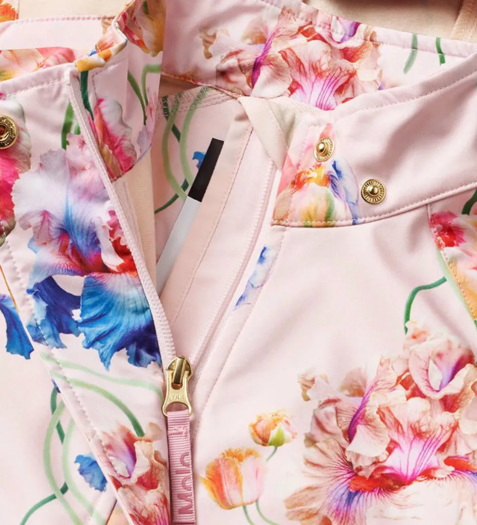 Skøn Molo softshelljakke i rosa med et alloverprint af store farverige blomster. Bagpå er der en stor refleks i højre side.