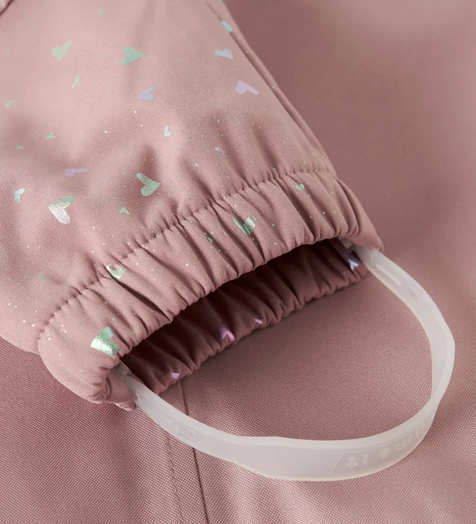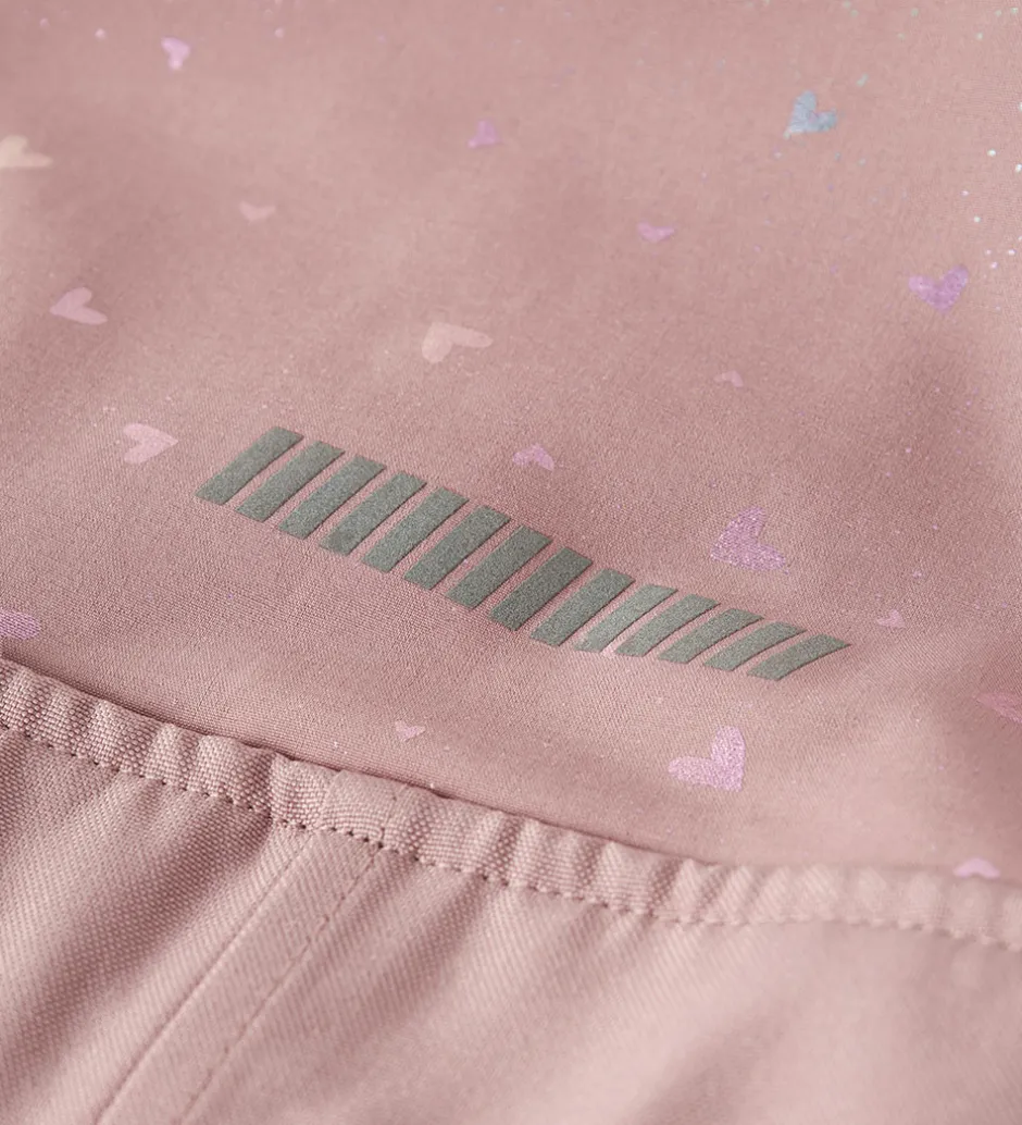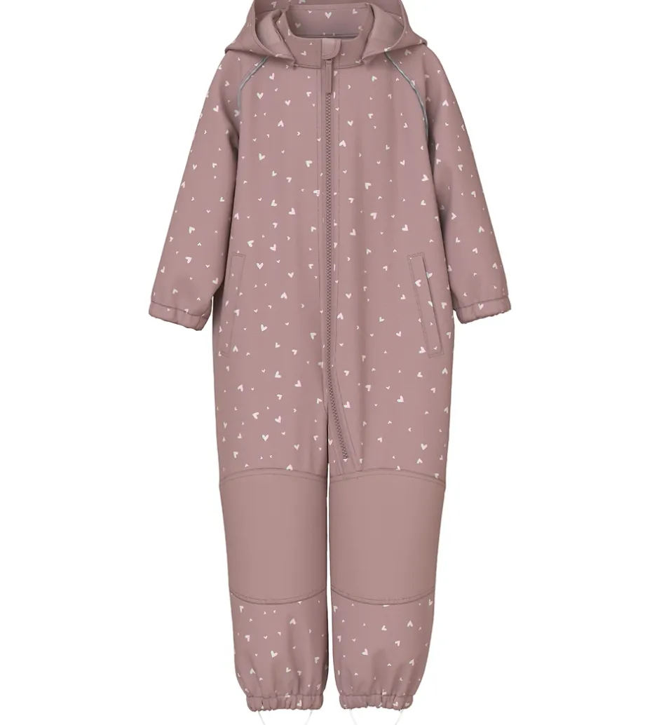 Dejlig Name It softshelldragt i støvet rosa med et alloverprint af hjerter i skinnende, changerende farver.