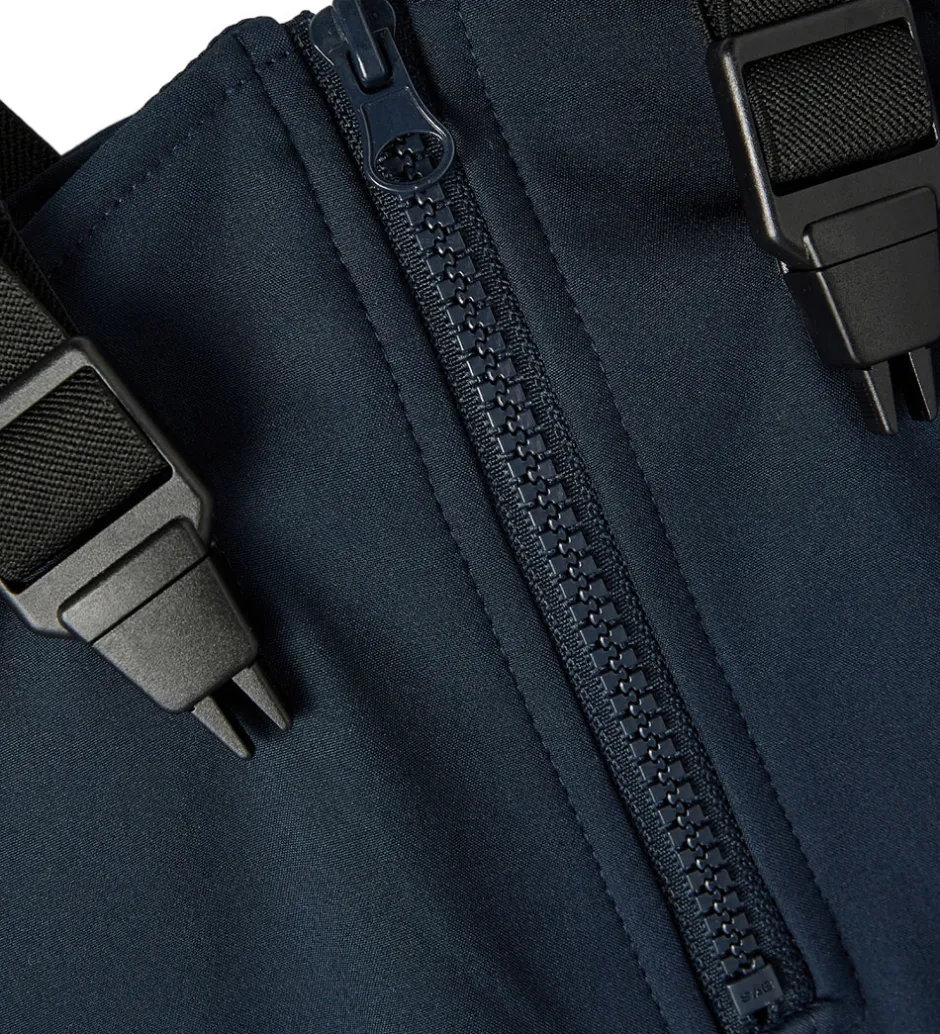 Name It softshellbukserne har justerbare elastikseler, som åbnes fortil med klikspænder, og softshellbukserne åbnes fortil med en lynlås. I ryggen er der en bred elastik, som sikrer en god pasform. Buksebenene har elastikkanter, og der er aftagelige, justerbare gummistropper til at sætte under støvlerne.