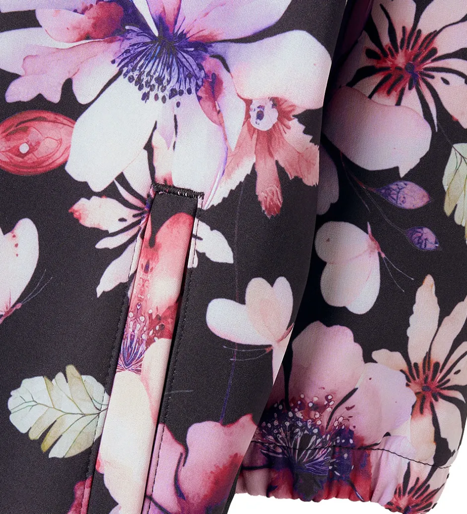 Dejlig Name It softshelldragt i sort med et alloverprint af blomster og sommerfugle i rosa, lilla og grønne nuancer.