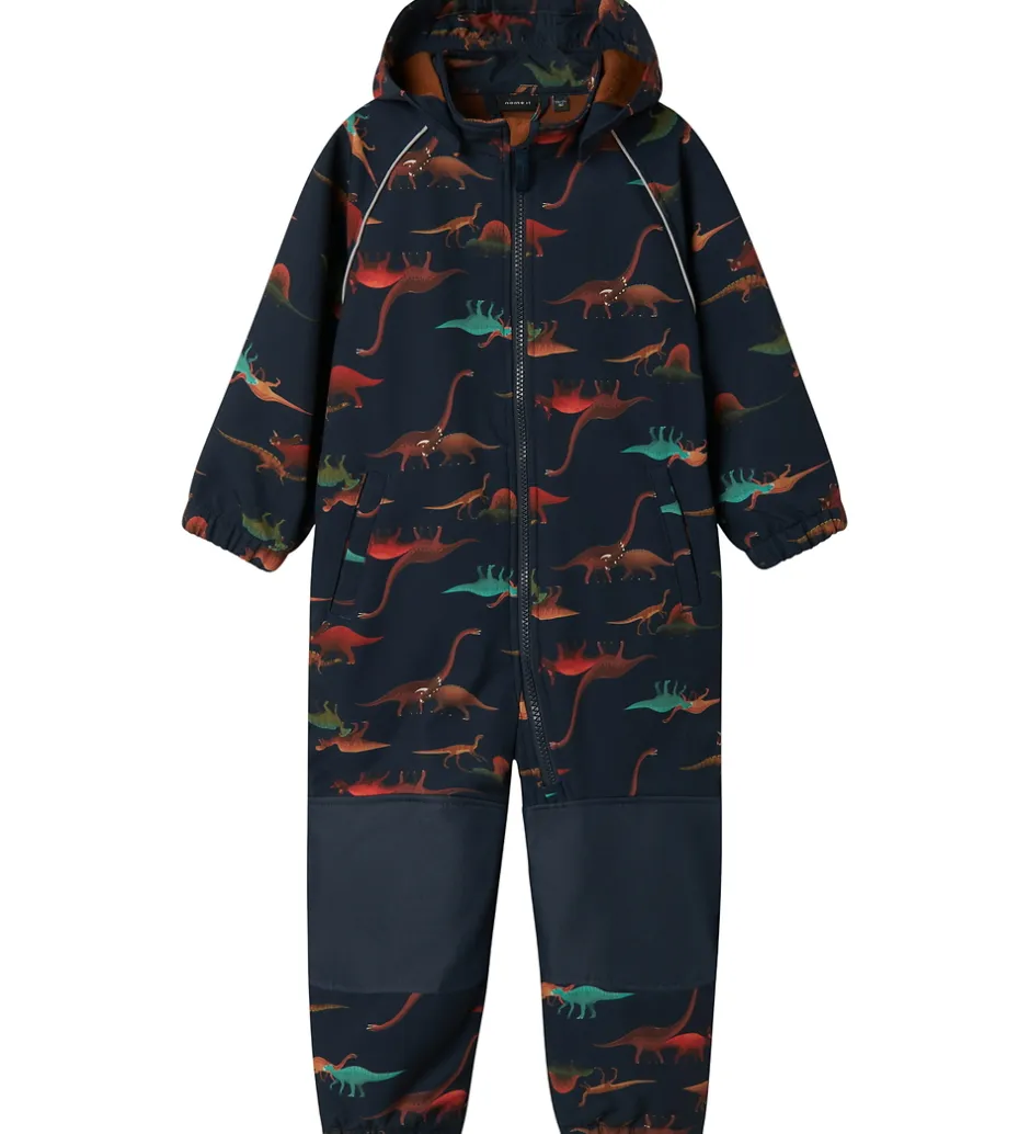 Dejlig Name It softshelldragt i navyblå og med et farverigt print af dinoer. Foret er i en brun nuance.
