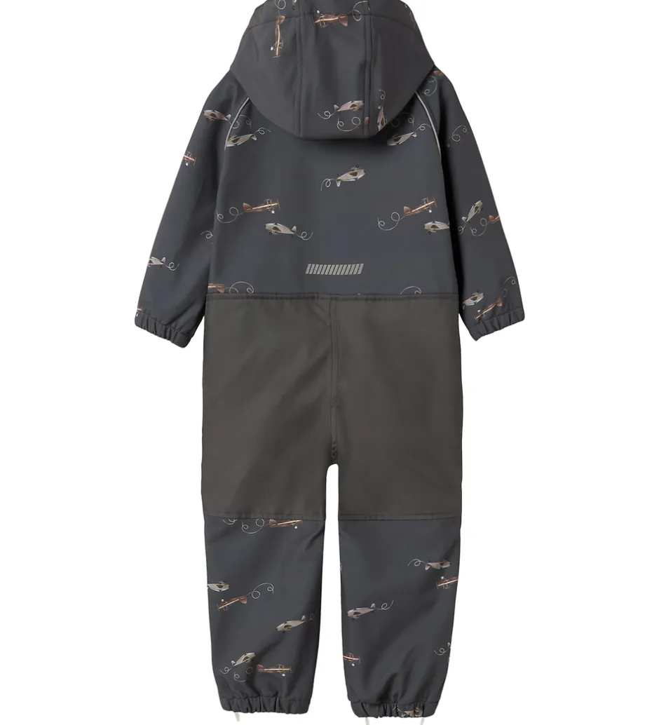 Dejlig Name It softshelldragt i mørkegrå og med print af flyvermaskiner. Foret er i en brun nuance.