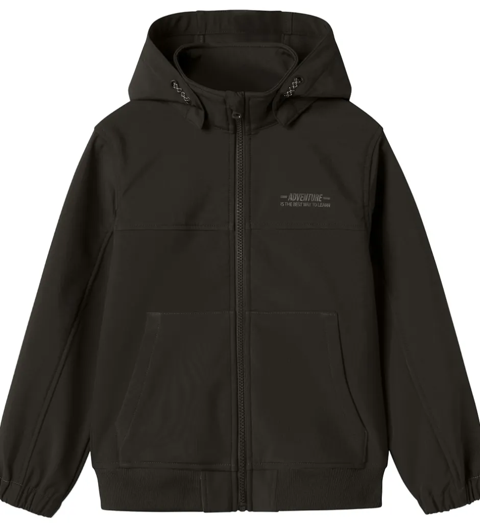 Fin Name It softshelljakke i sort med et diskret gummiprint på venstre bryst.