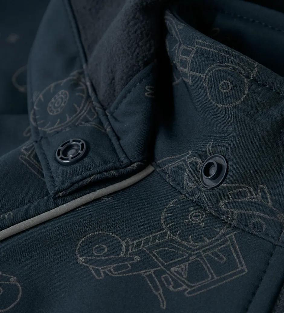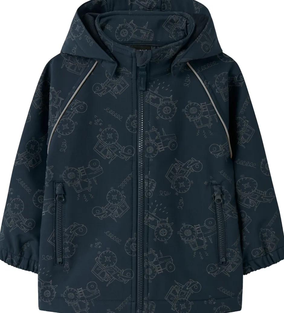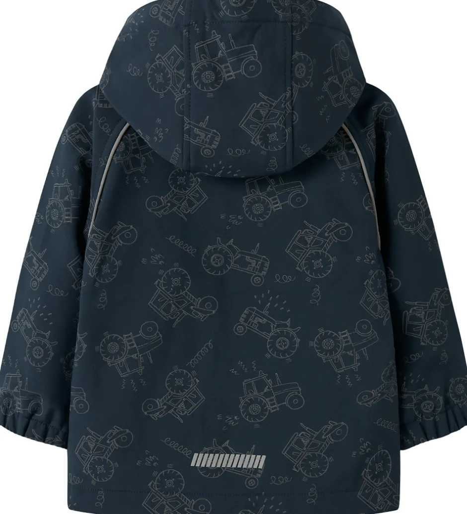 Dejlig Name It softshelljakke i navy med et refleksprint af traktorer.