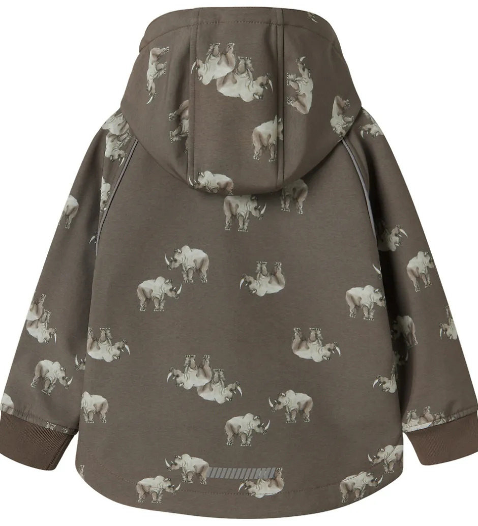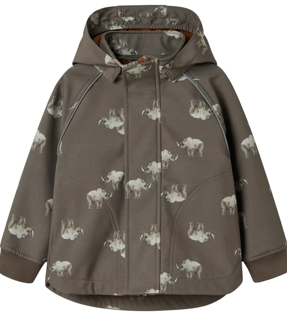 Dejlig Name It softshelljakke i støvet mørkegrøn og med alloverprint af næsehorn.