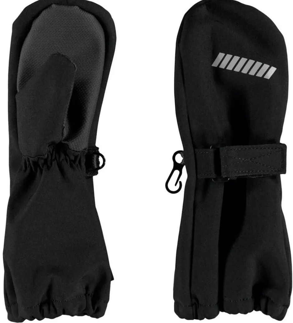 Smarte Name It softshellluffer i sort med et refleksprint på den højre.