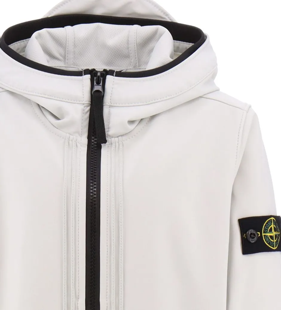 Flot Stone Island softshelljakke i ensfarvet lysegrå og med en sort lynlås. Øverst på venstre ærme sidder det ikoniske logomærke fast med knapper.