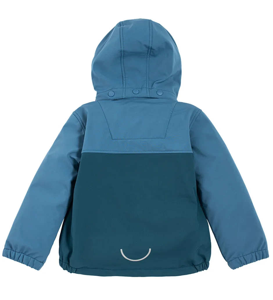 Softshelljakken har praktiske reflekser på lynlåsenes vedhæng, og der er en refleksstribe på hætten samt et refleksprint fortil i højre side og nederst på ryggen. Softshelljakken har et blødt fleecefor i petroleumsblå.