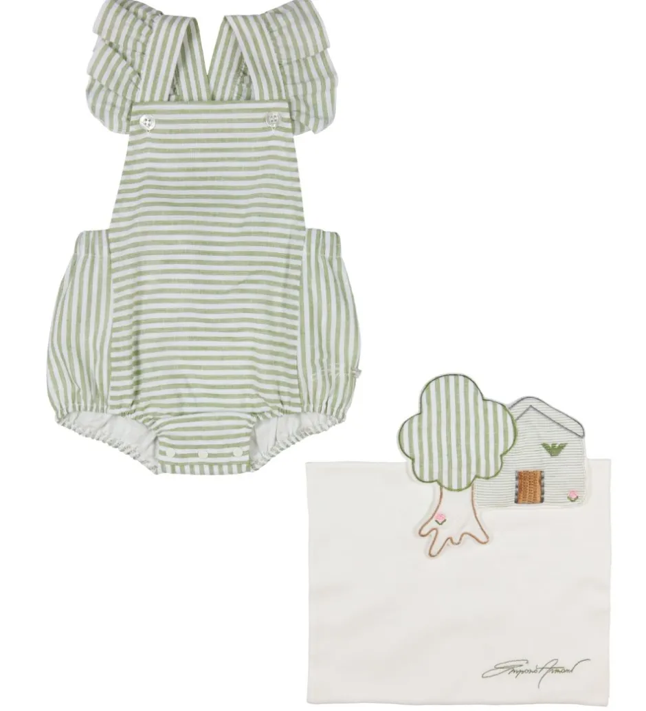Sød Emporio Armani gaveæske med en sommerdragt og en nusseklud. Sommerdragten har smalle striber i grøn og hvid, og nussekluden er hvid md en stor applikation, der forestiller et hus og et træ med smalle striber i hvid og grøn og dekoreret med små rosa blomster.