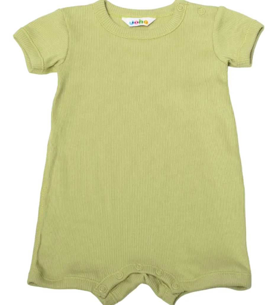 Joha sommerdragten har korte ærmer og helt korte ben, og den har smalle ribkanter i alle åbninger. Sommerdragten åbnes ved den venstre skulder med to trykknapper, og den kan åbnes helt op mellem benene med trykknapper.